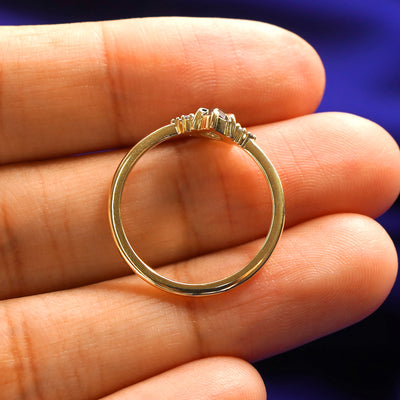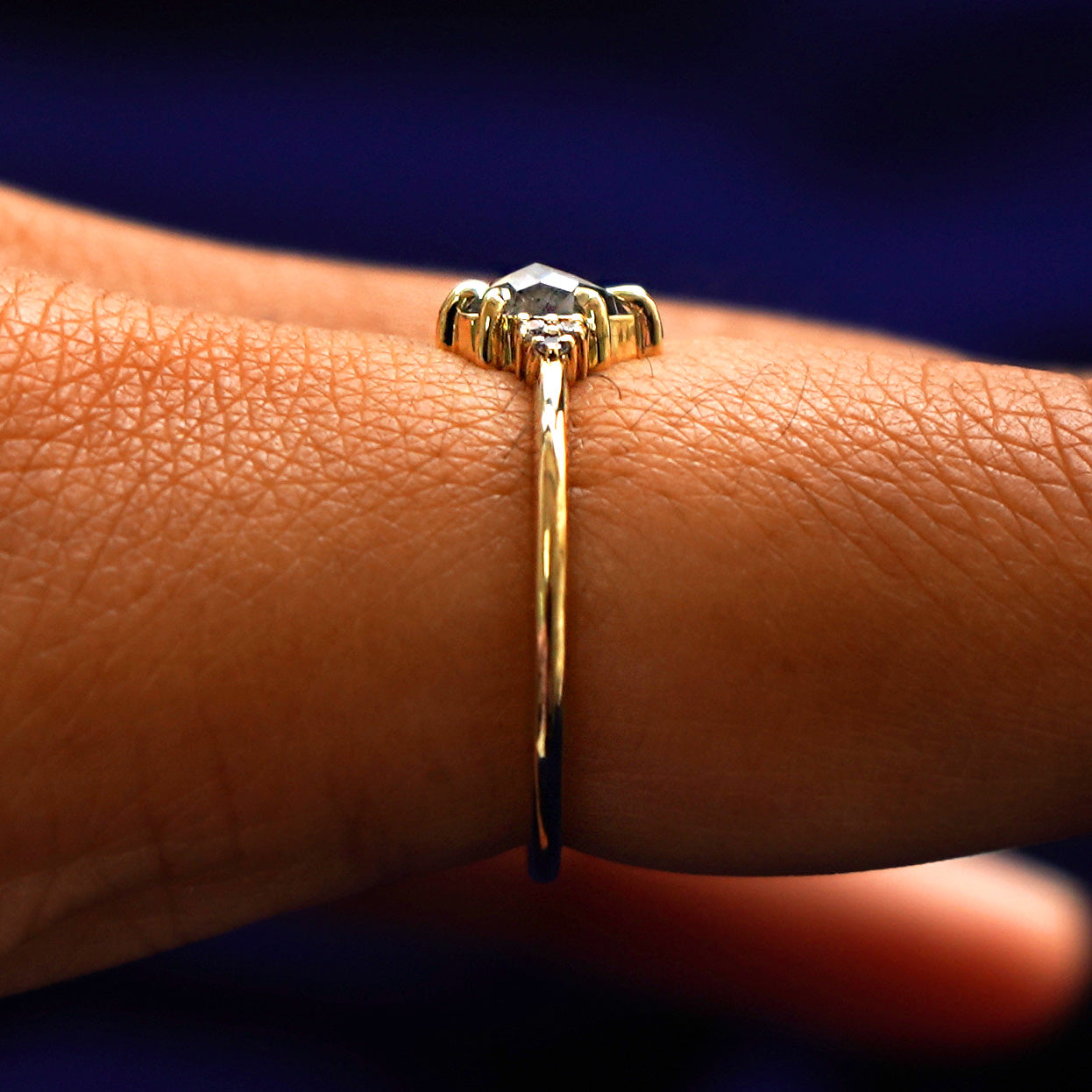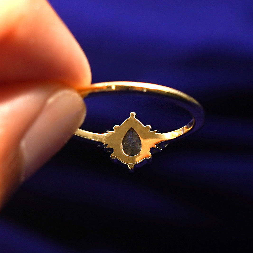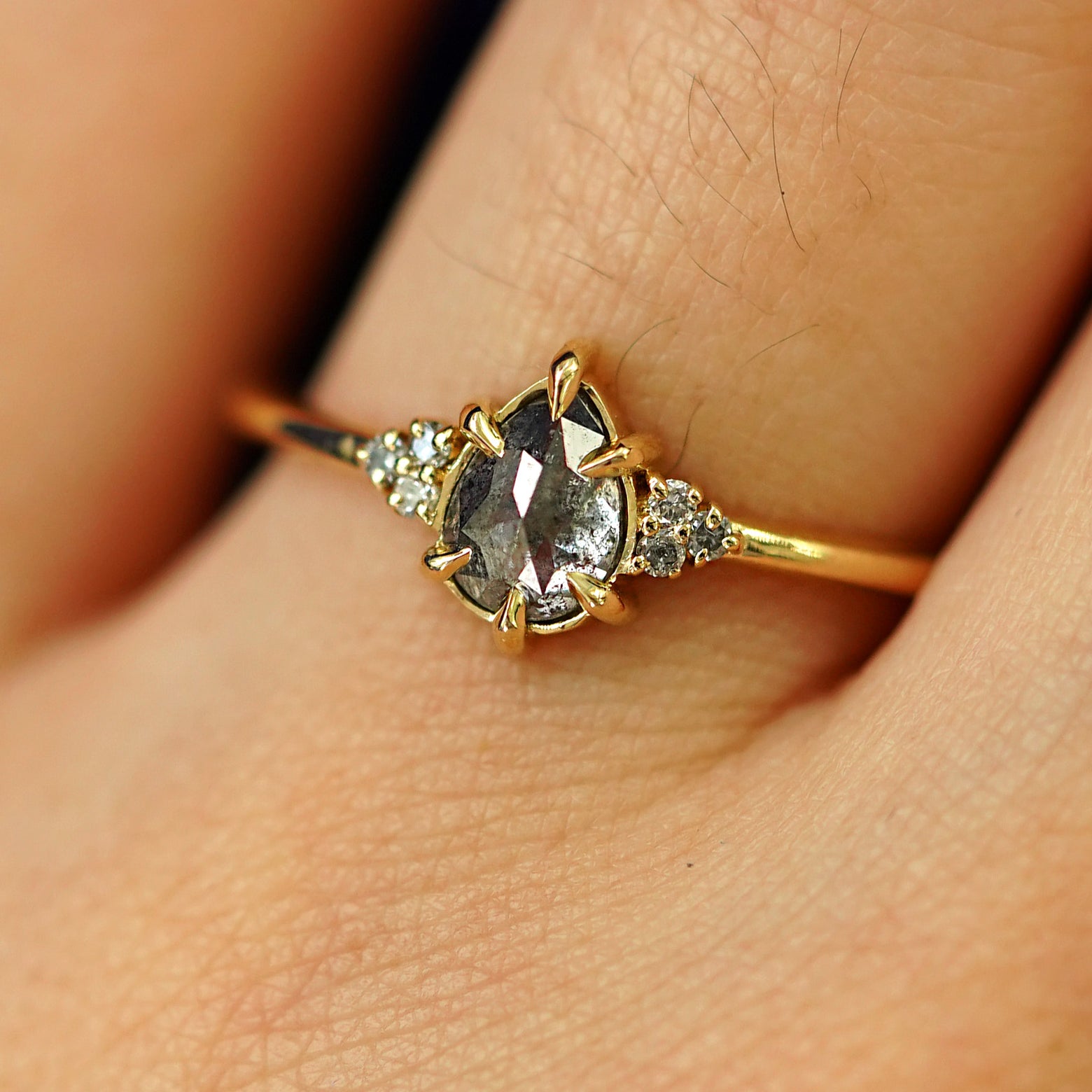 Underside view of a solid 14k gold Pear Salt and Pepper Diamond Ring