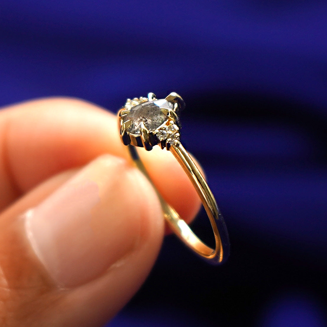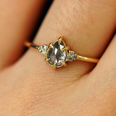 Close up view of a model's hand wearing a yellow gold Pear Salt and Pepper Diamond Ring on their finger