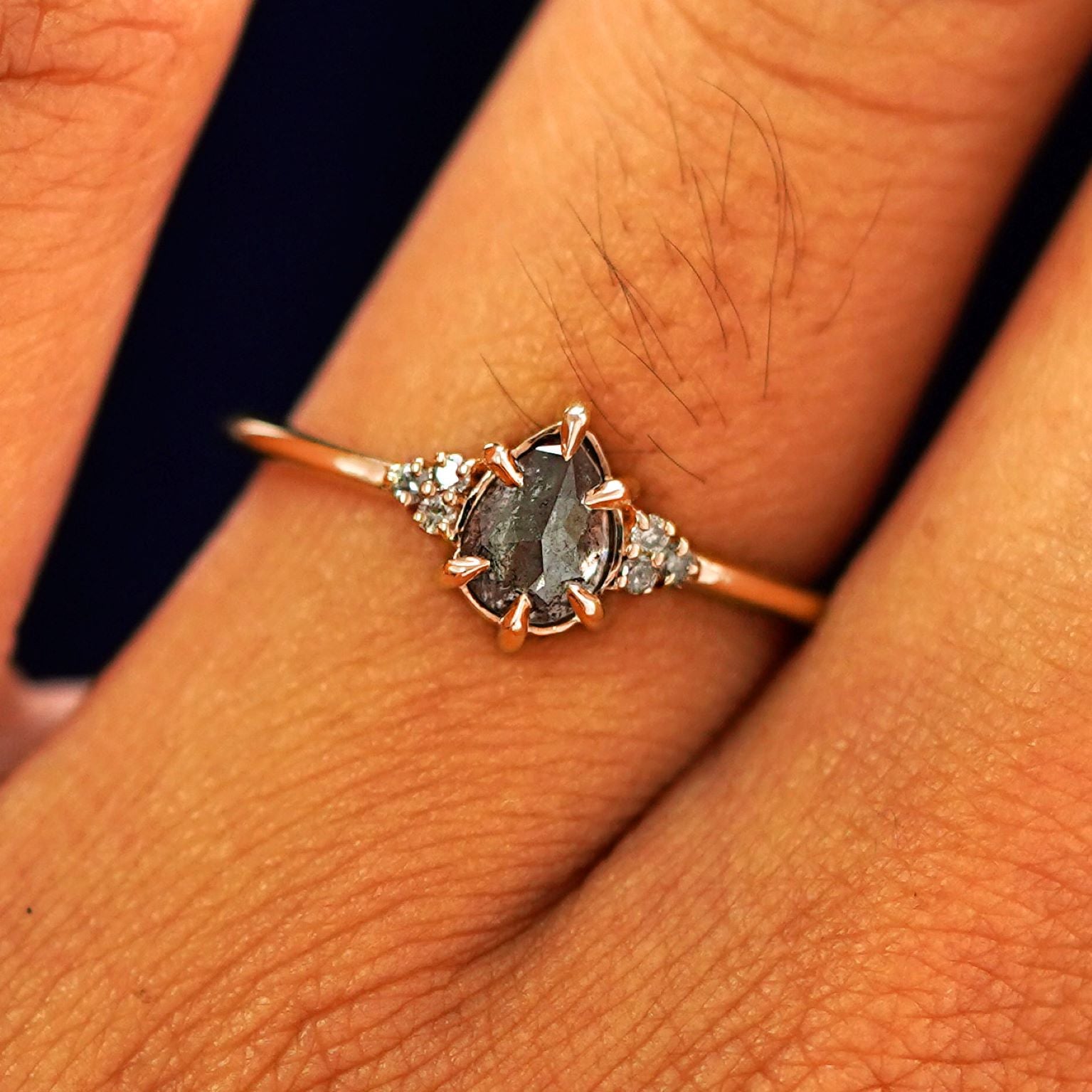 Close up view of a model's fingers wearing a 14k rose gold Pear Salt and Pepper Diamond Ring