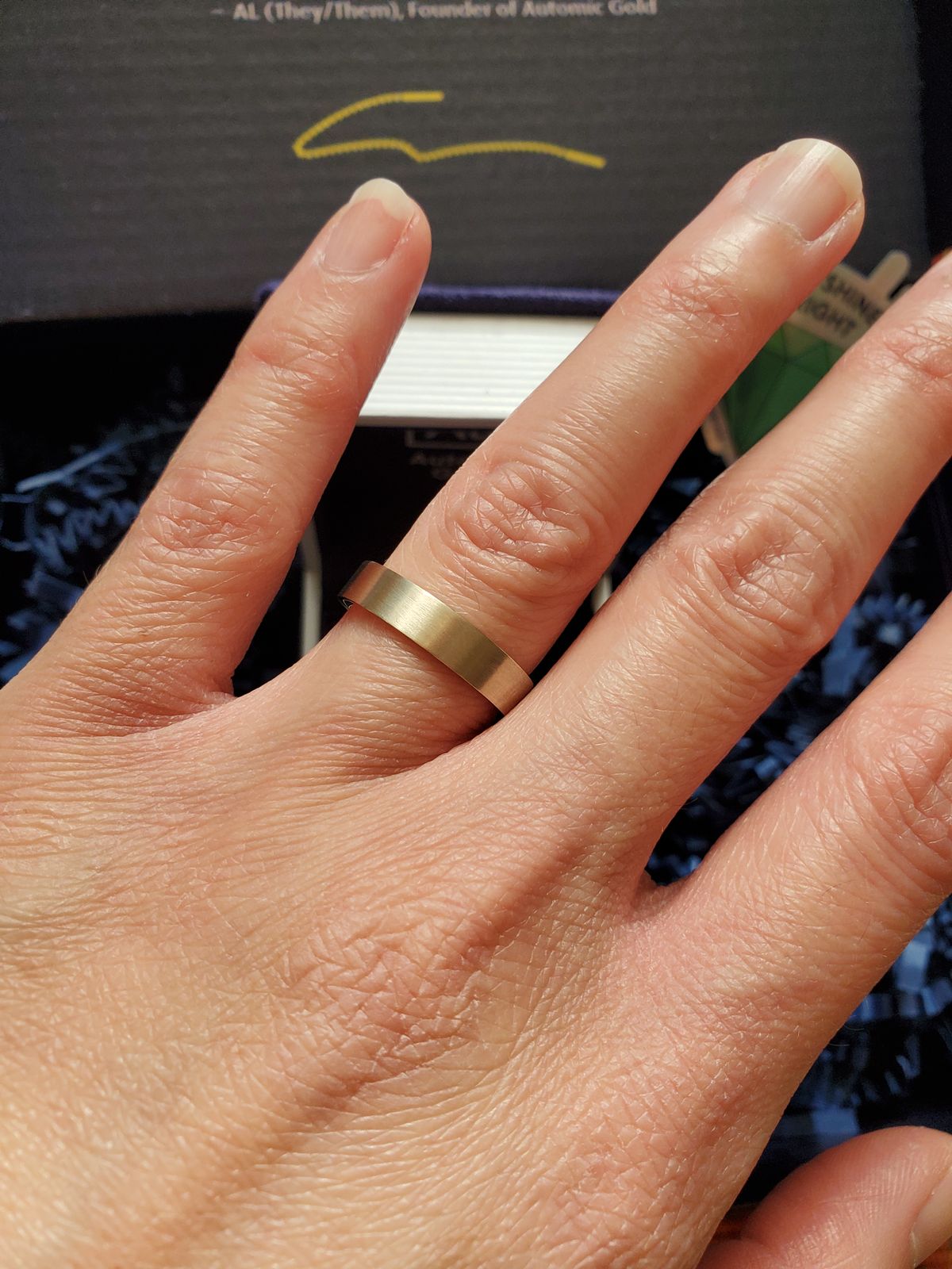 I am impressed with the quality and simple beauty of this ring. It is also very comfortable. Ordering online was easy and it arrived just as expected. I look forward to ordering more jewelry from this shop in the future.