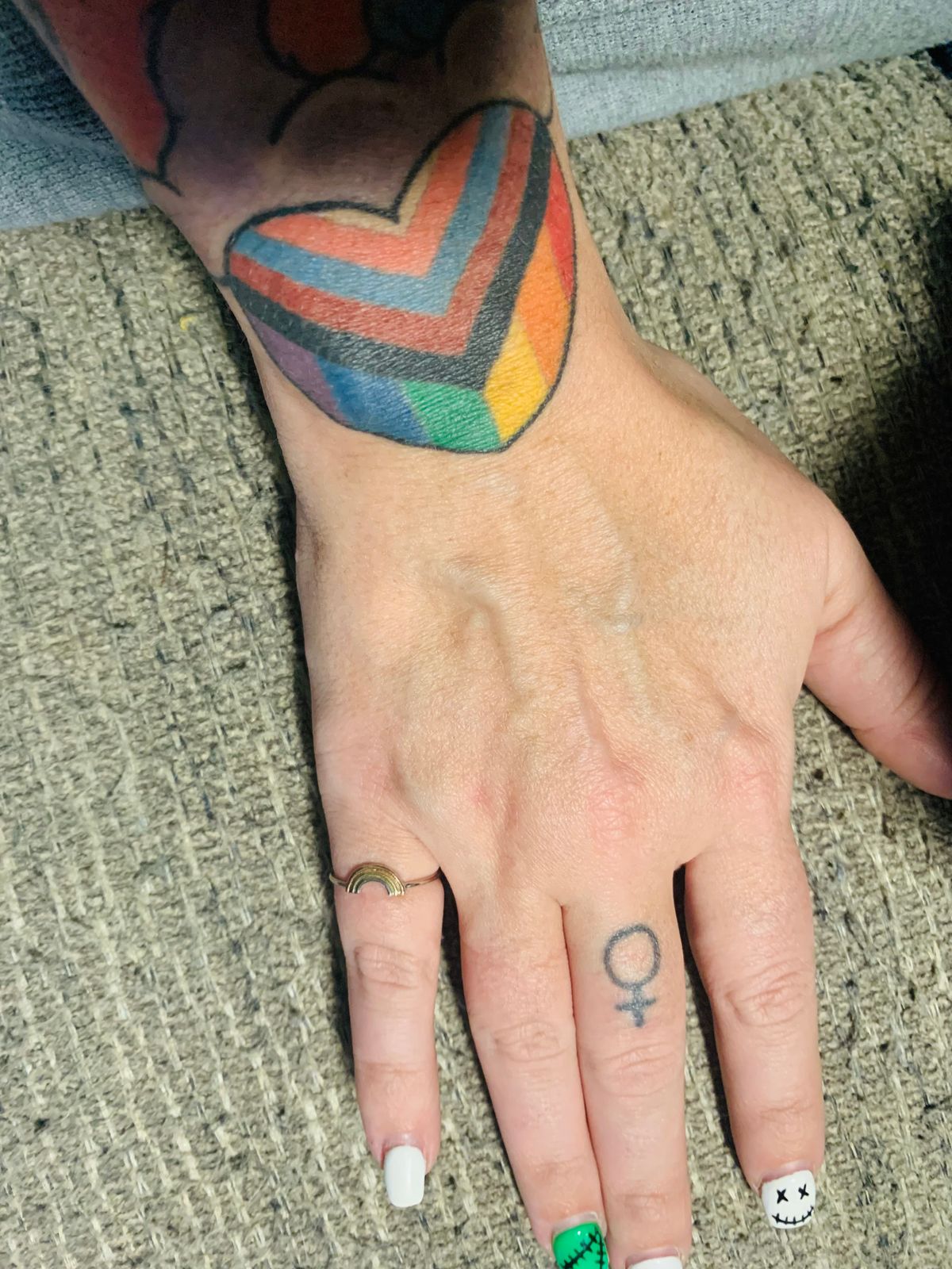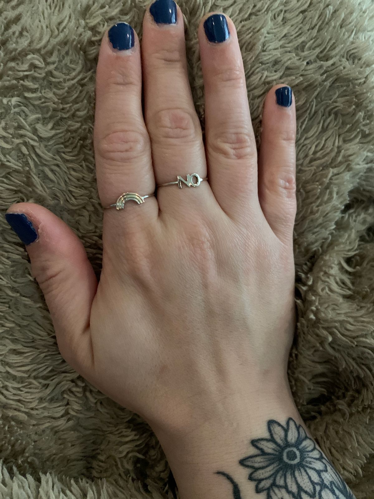 A Rainbow Ring in a model's hand showing the thickness of the band