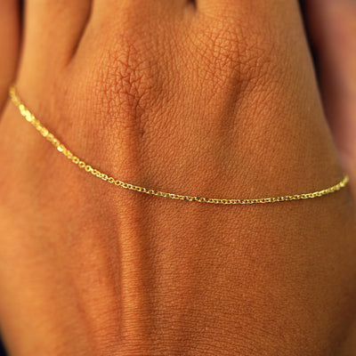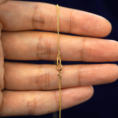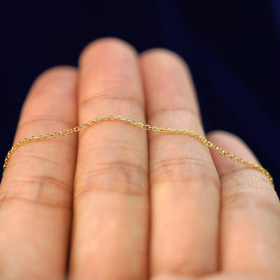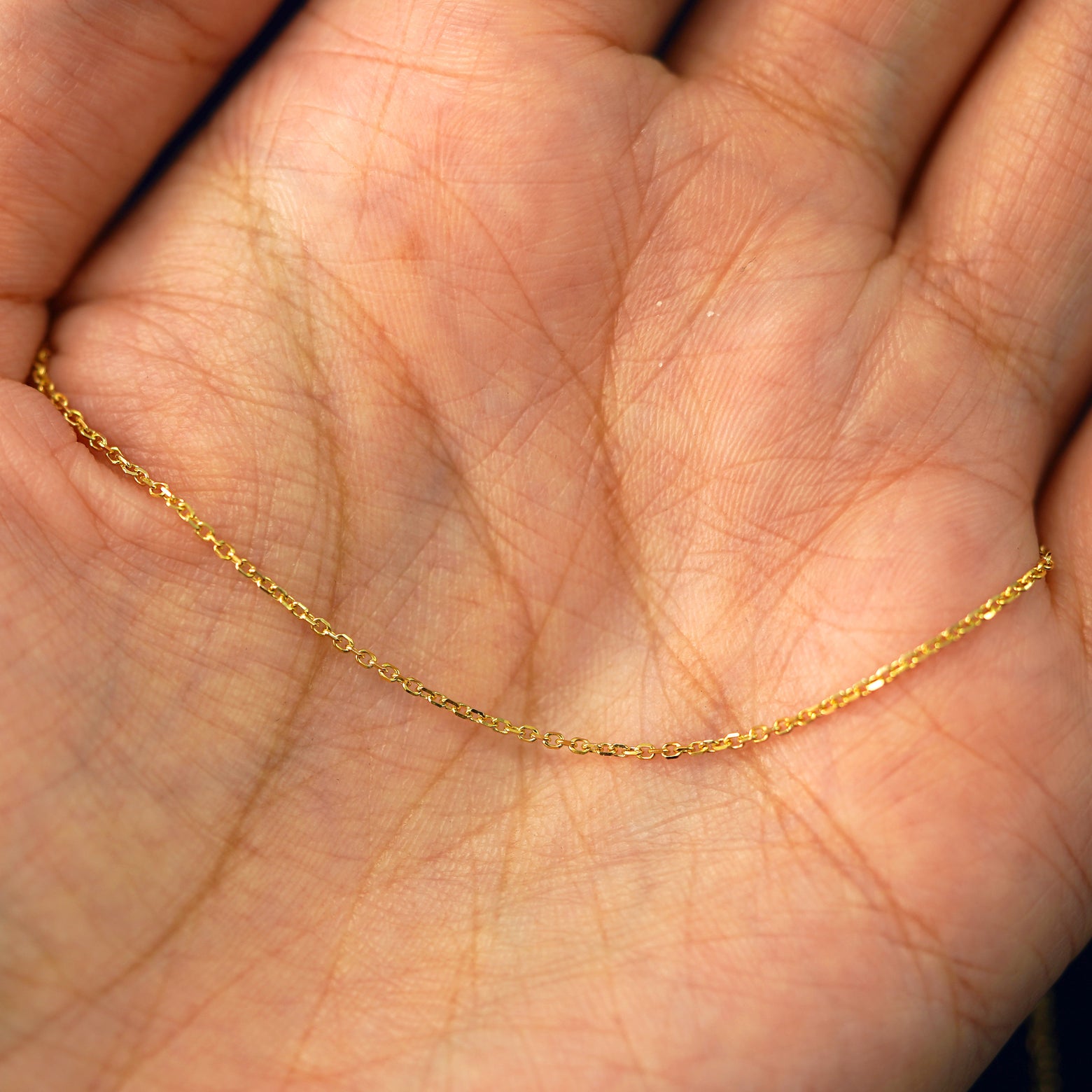 A model's hand holding a yellow 14k gold Medium Cable Chain with an Automic Gold AU spring ring lock