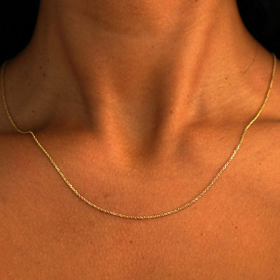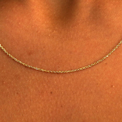 A model's neck wearing a solid 14k yellow gold Medium Cable Chain