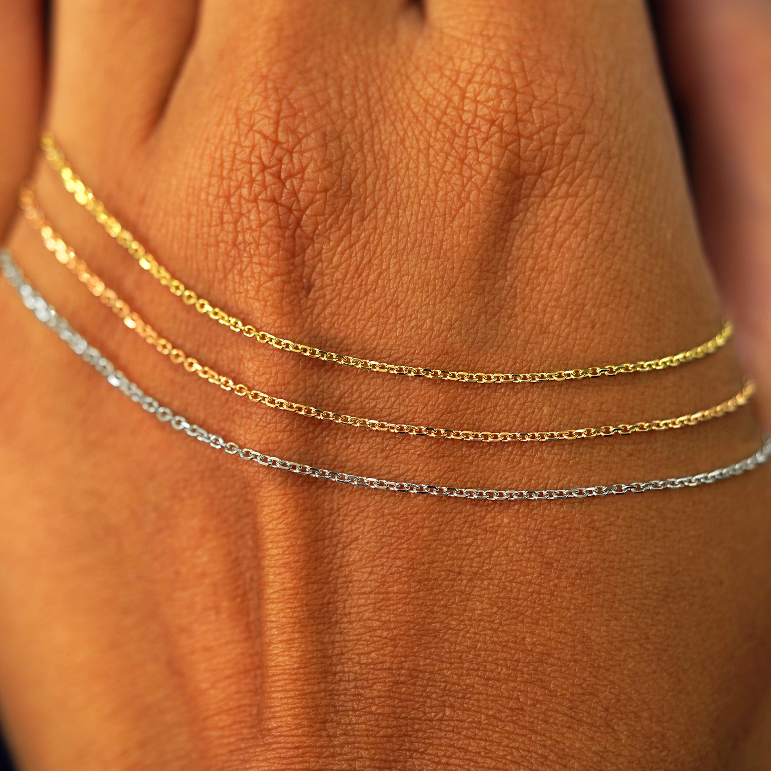 A companion to our classic Cable Chain and Thick Cable Chain, this is the perfect sized necklace for everyone who wants to add just a little extra style. With its classic oval links and diamond cut design, this solid 14k gold necklace is sparkling, durable, and comfortable. Secures with a spring ring clasp and an easy-to-grip Automic Gold AU plate.