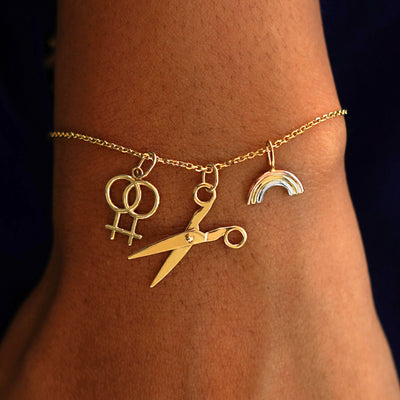 A model's wrist wearing a yellow gold Medium Cable Chain with a Lesbian Charm, a Scissors Charm, and a Rainbow Charm