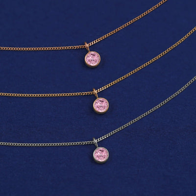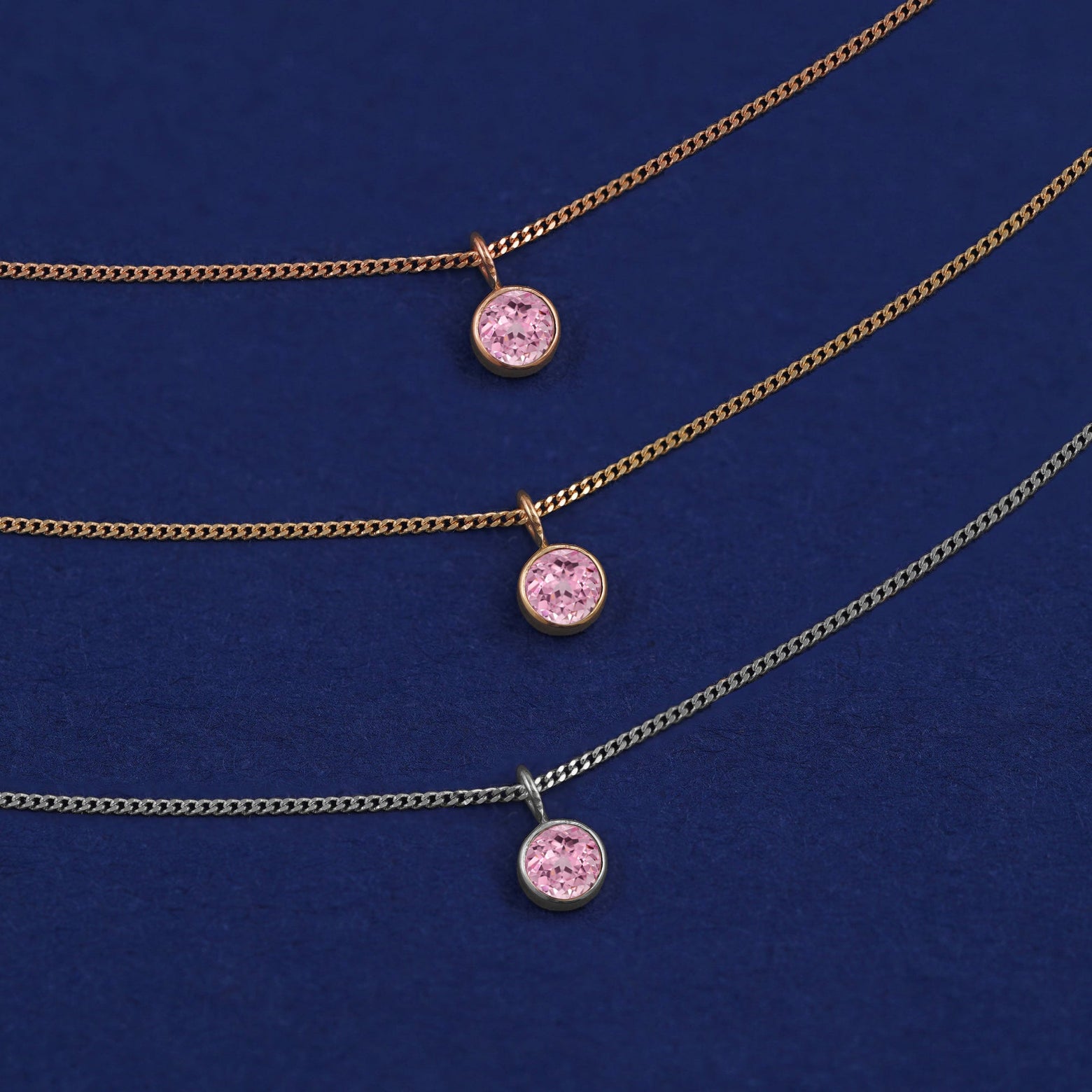 Three versions of the Pink Sapphire Necklace shown in options of yellow, white and rose gold on a dark blue background