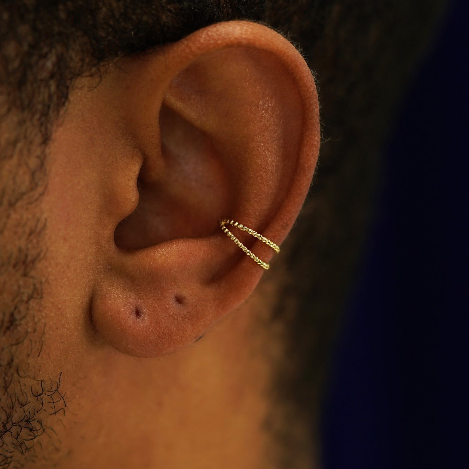 Close up view of a model's ear wearing a 14k yellow gold Bead Ear Cuff