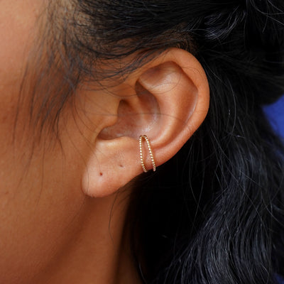 Close up view of a model's ear wearing a 14k Champagne gold Bead Ear Cuff