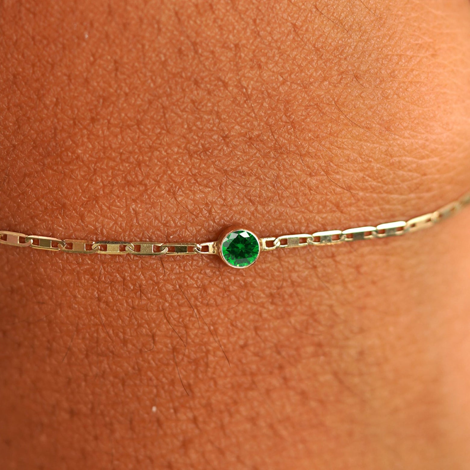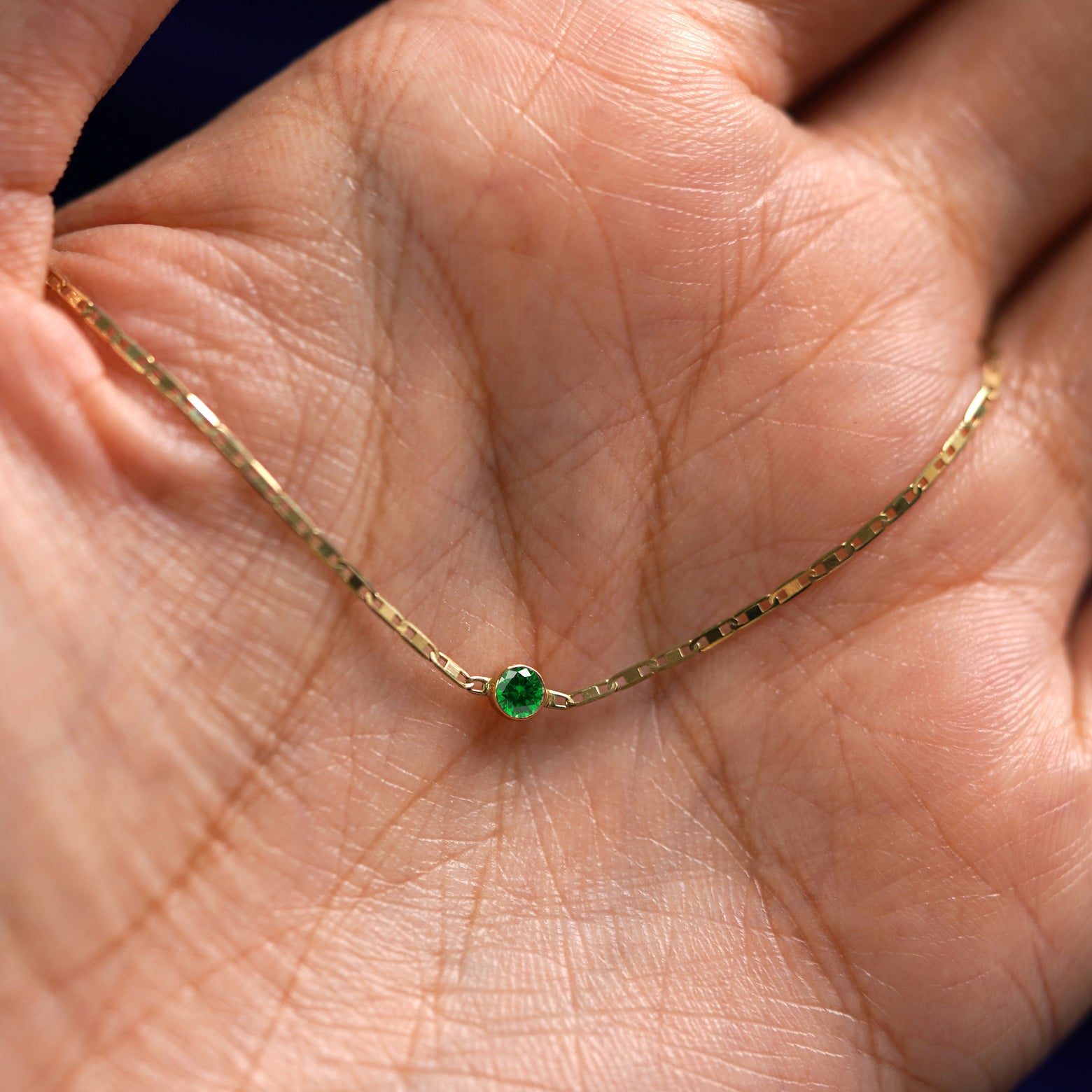 The Emerald gemstone bracelet will make everyone’s favorite color green. The bold and beautiful color of the Emerald solitaire is enhanced by the sparkle of our 14k solid gold Valentine Chain Bracelet. This delicate piece of May birthstone jewelry is perfect to wear all year round. Secures with a lobster lock and easy-to-grip Automic Gold AU plate.