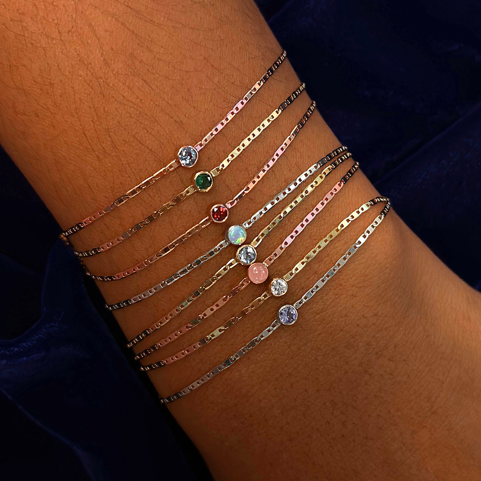 A model's wrist wearing a stack of eight different Gemstone Bracelets with different stones in different metal colors