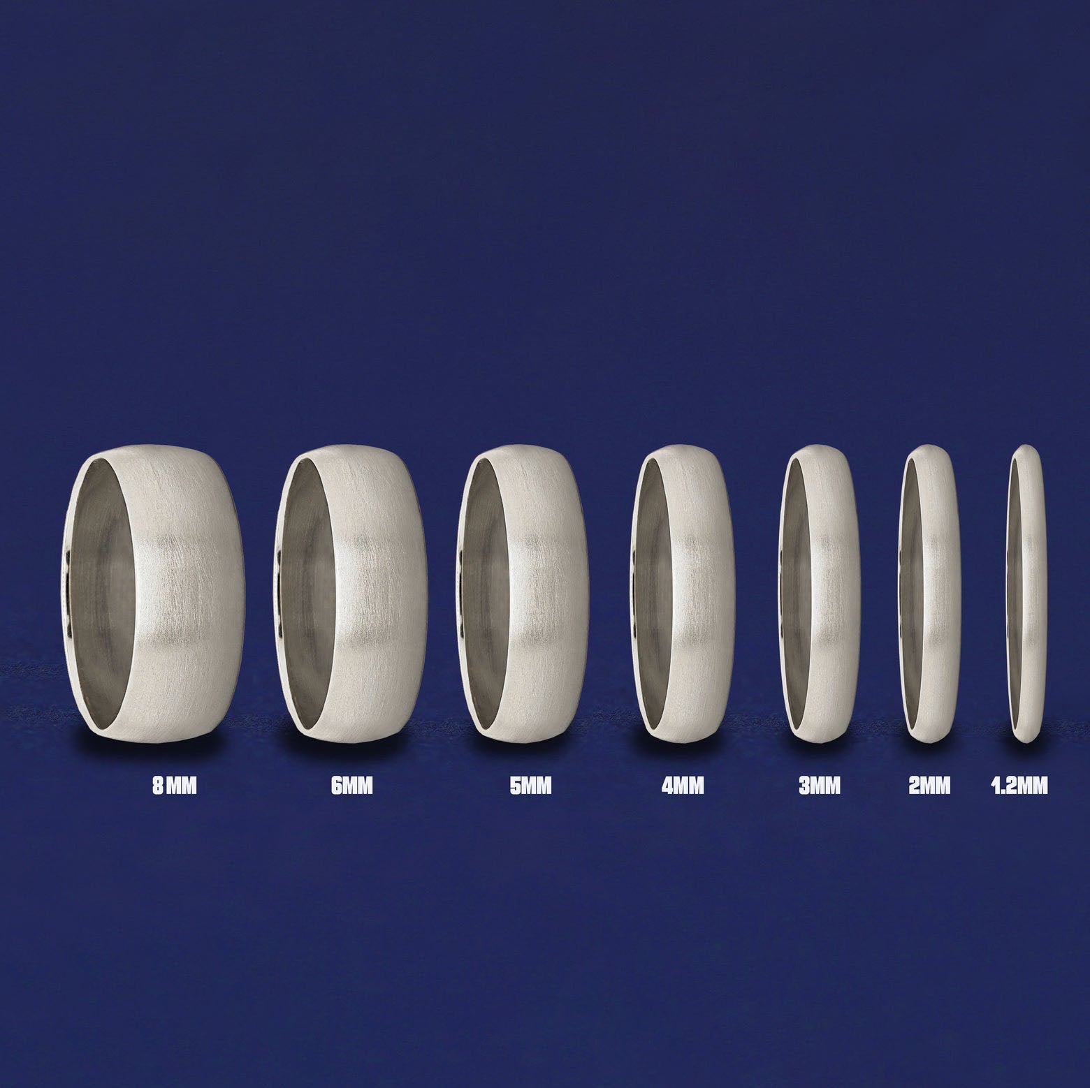 Seven versions of the Platinum Curvy Matte Band showing the different thickness options of the ring from 8mm to 1.7mm