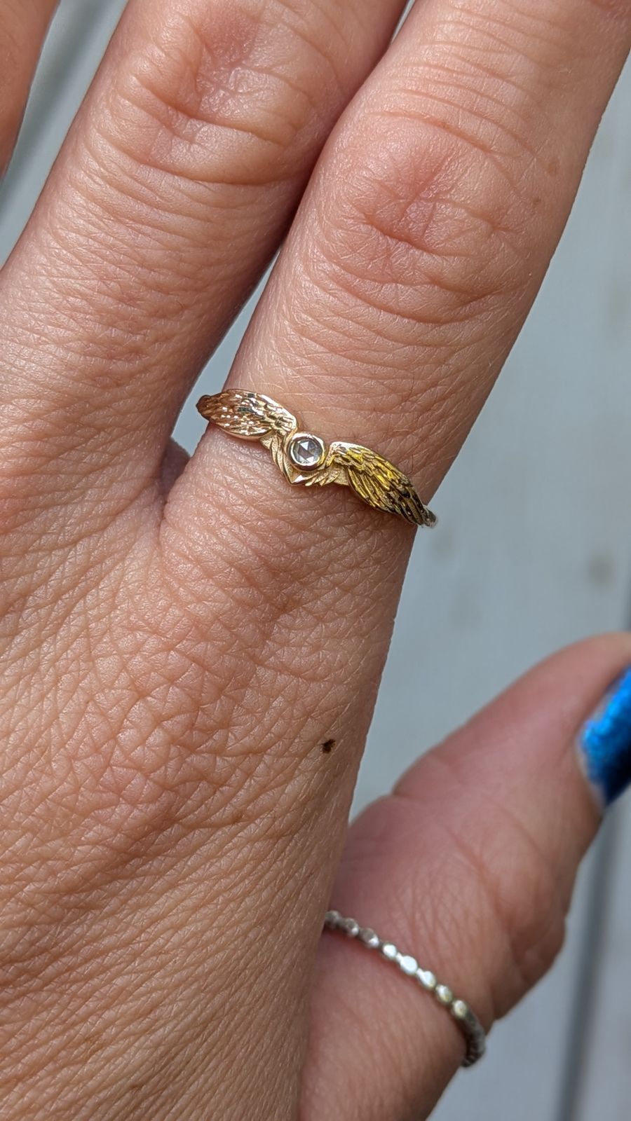 A model holding a solid gold diamond angel wings ring in the palm of their hand