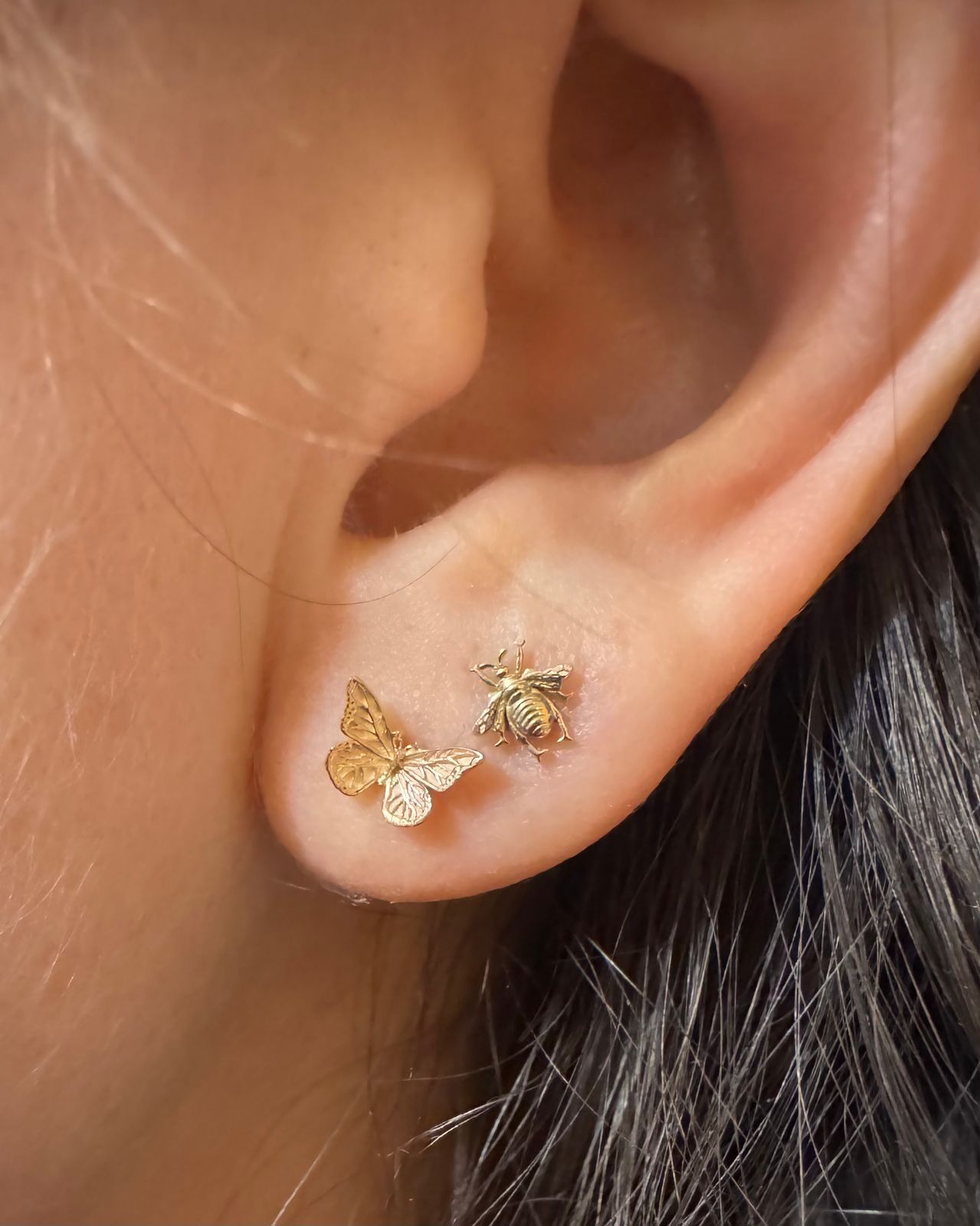 Close up view of a model's ear wearing a 14k yellow gold Mini Butterfly Flatback Piercing