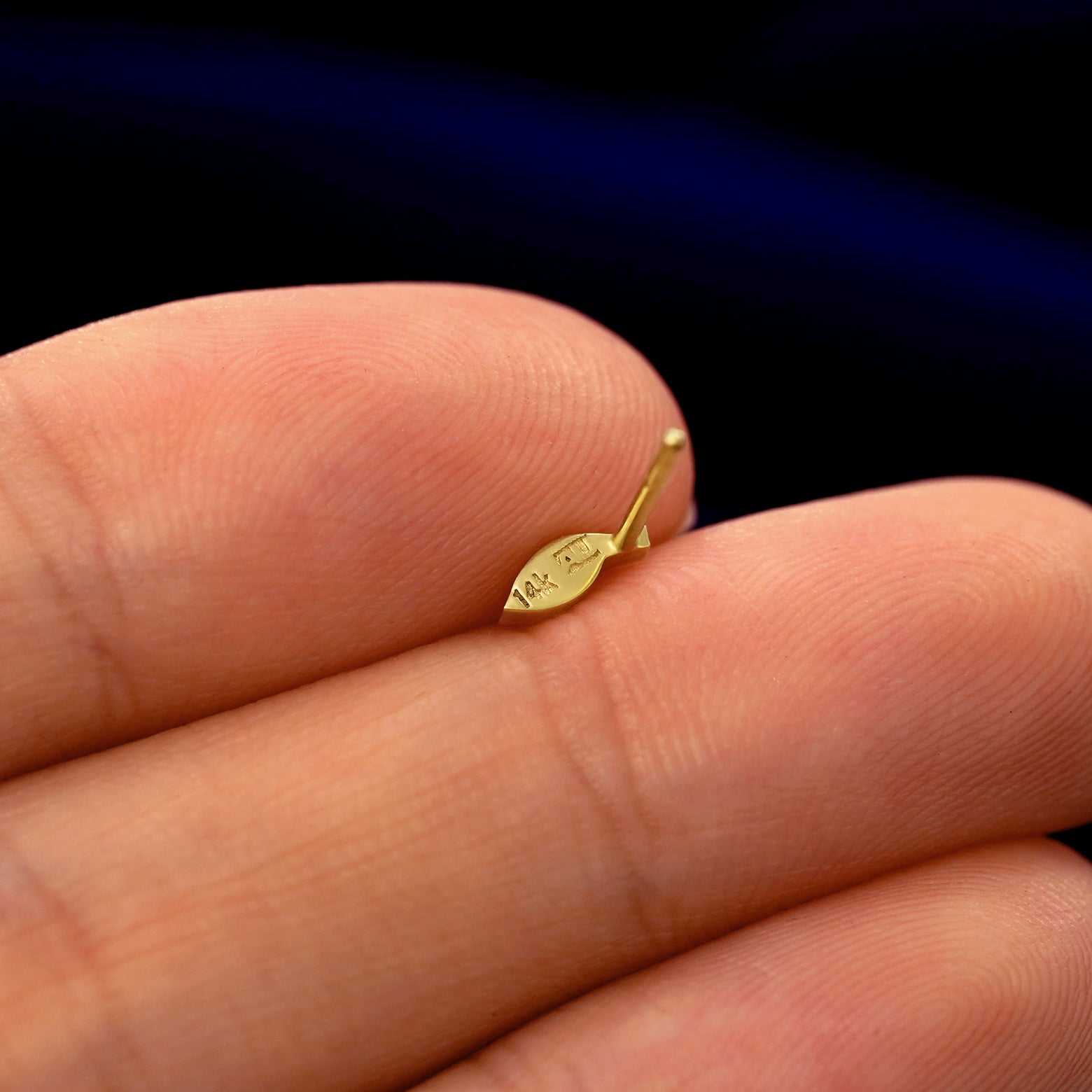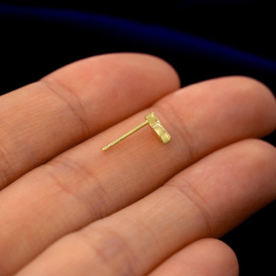 A 14k gold Mini Leaf Earring in a model's hand resting on its face to show the back of the stud and the post