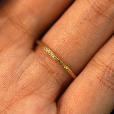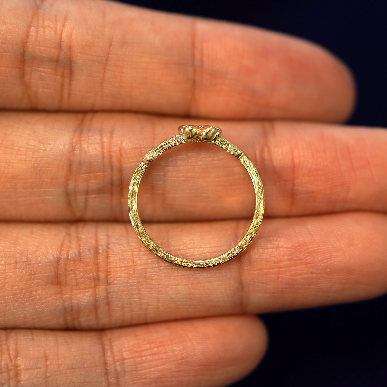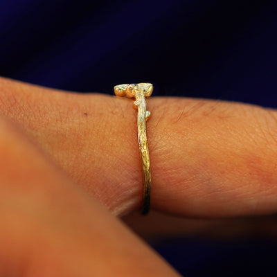 A yellow gold Sakura Ring in a model's hand showing the thickness of the band