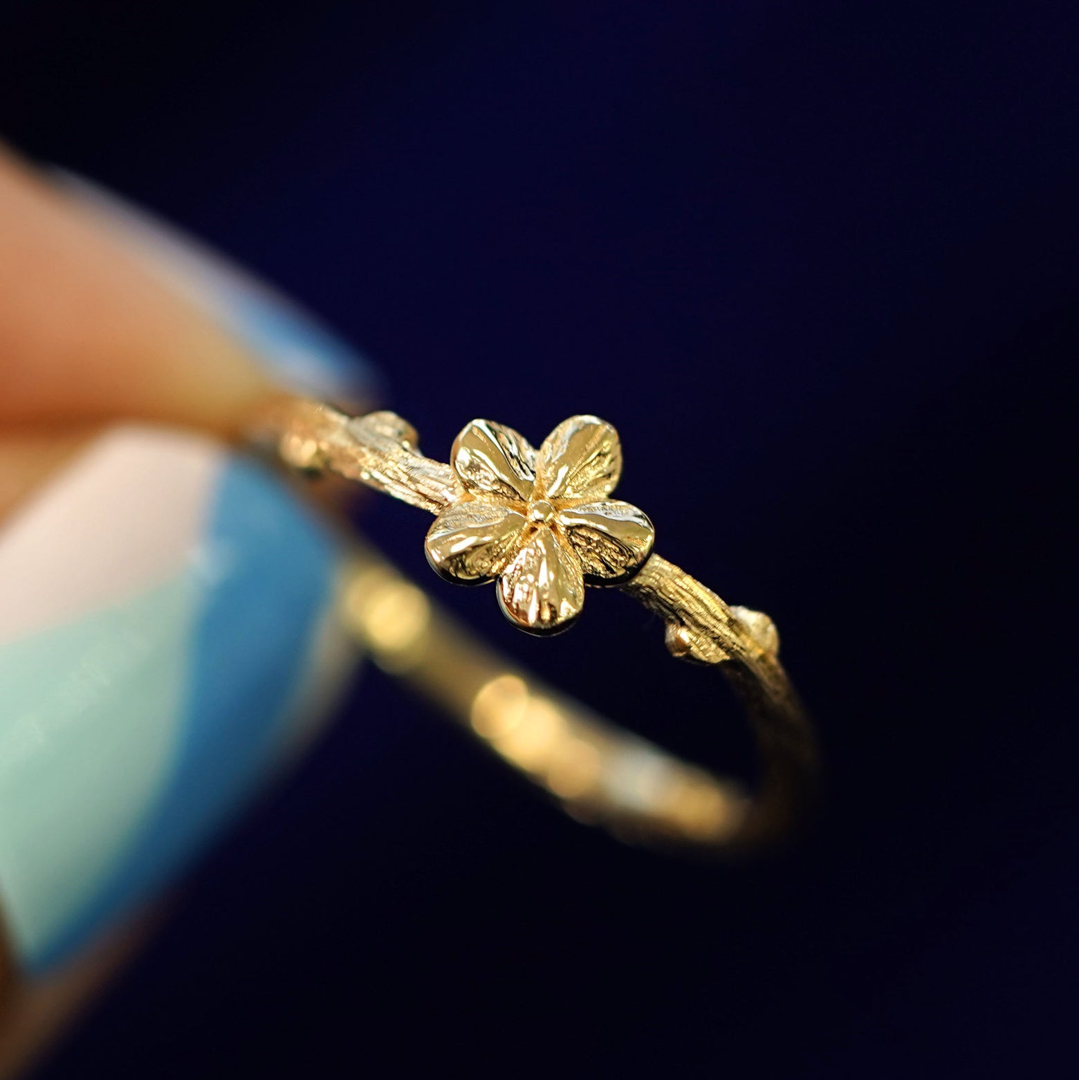Cherry blossoms are normally fleeting in their beauty—they only bloom for a short time each year—but this 14k solid gold Sakura ring will stay gorgeous forever. This lovely ring features an intricately detailed cherry blossom flower on a stunning band of carved branches that is still comfortable enough for everyday wear.