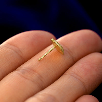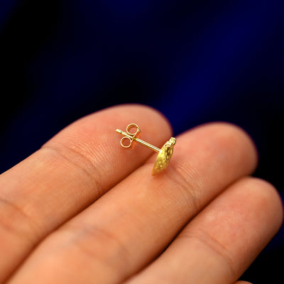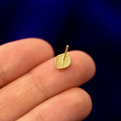 A 14k gold Strawberry Earring in a model's hand resting on its face to show the back of the stud and the post