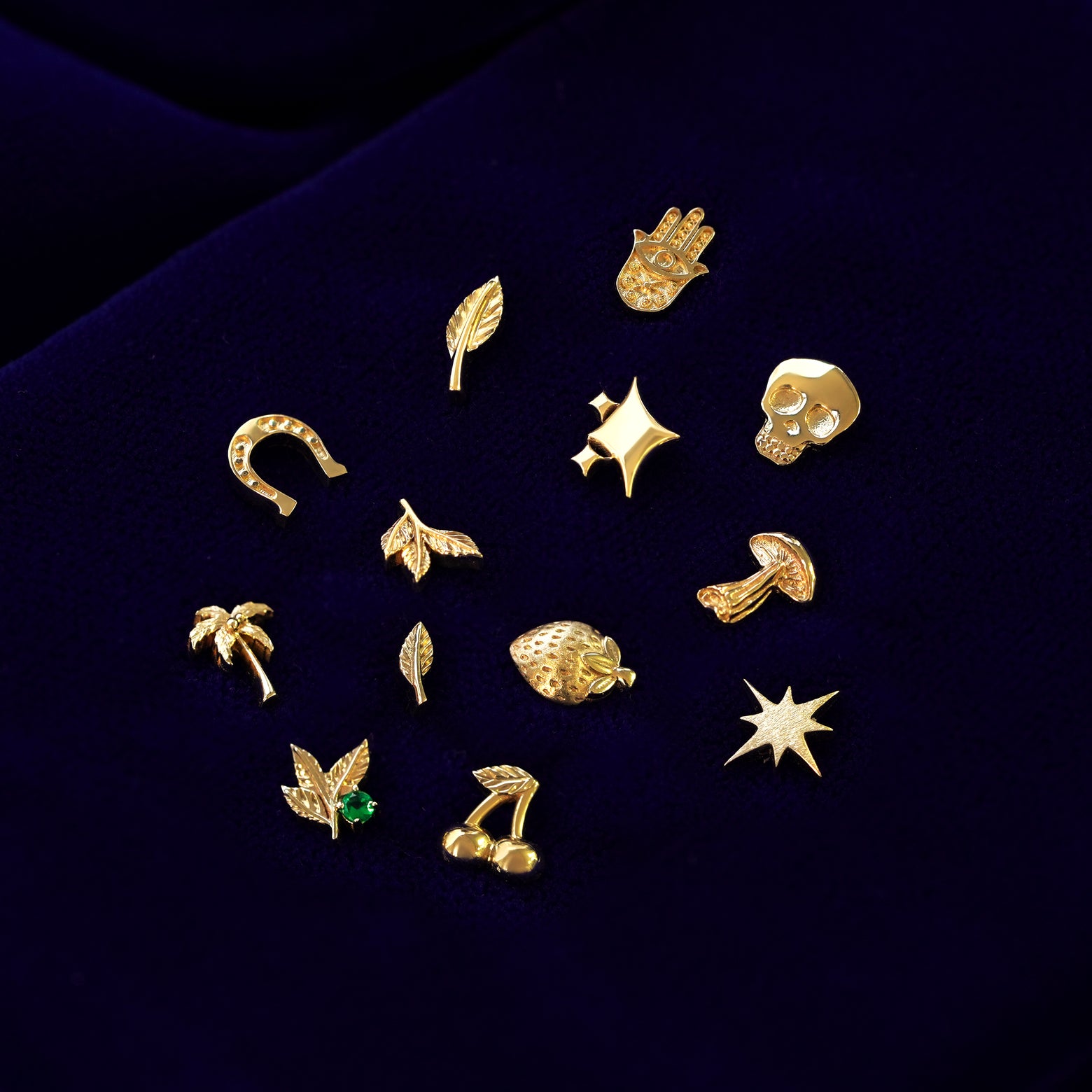 Various 14k yellow gold good luck and nature themed stud earrings on a dark blue cloth background