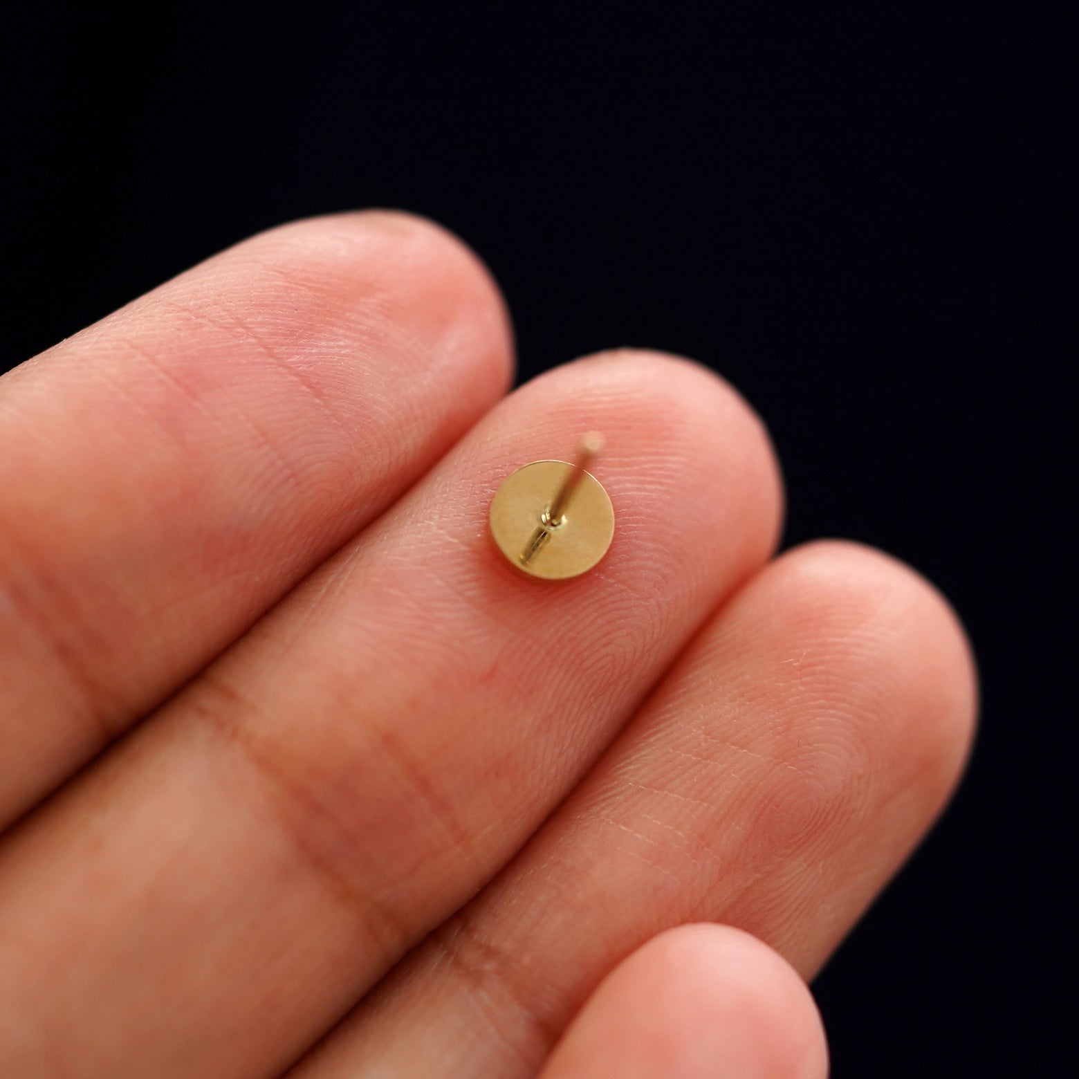 A yellow gold Medium Circle Earring laying facedown on a model's fingers to show the underside view