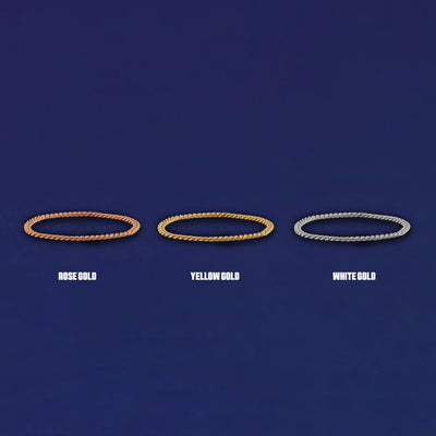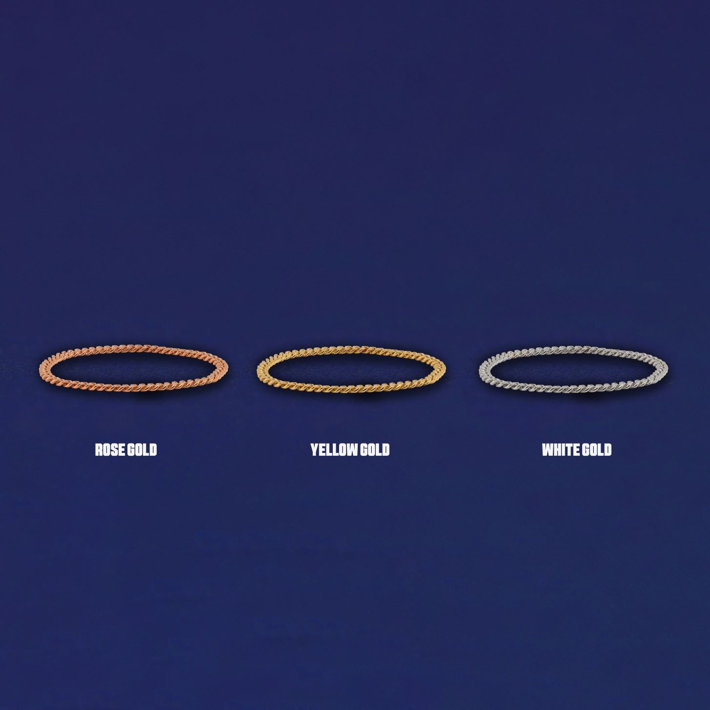 A solid yellow gold Mini Miami Ring twisted a model's finger