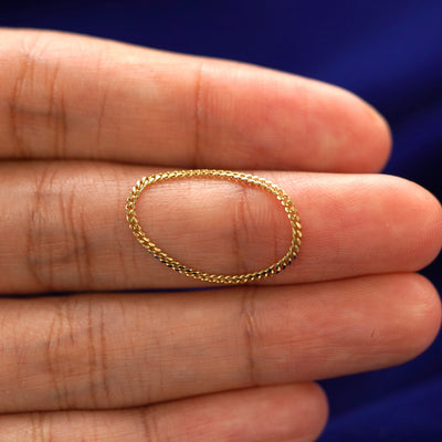 Close up view of a model's hand wearing a solid yellow gold Mini Miami Ring