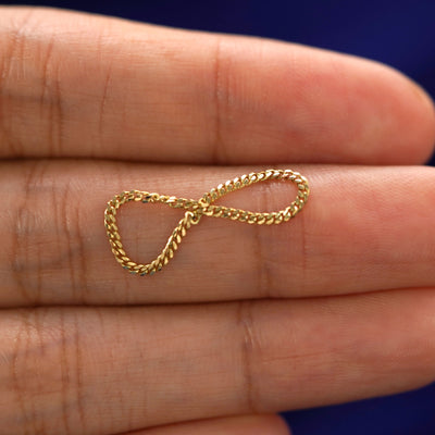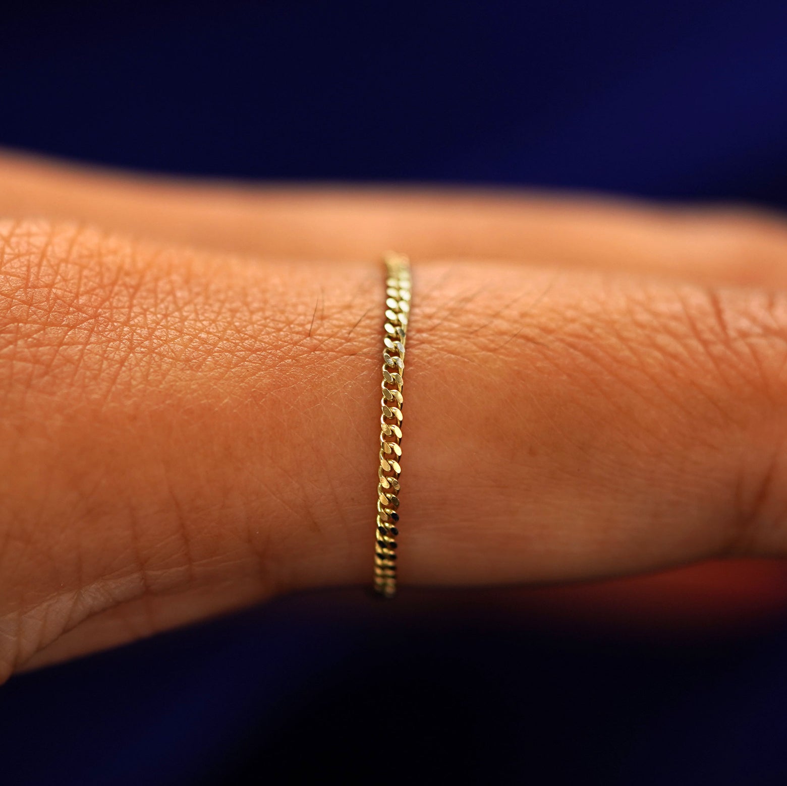 A yellow gold Mini Miami Ring draped over a model's finger to show the flexibility of the chain