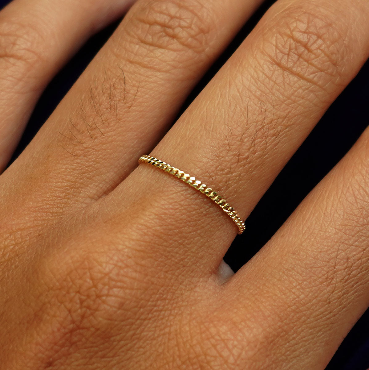 Close up view of a model's hand wearing a Cable Ring, a Figaro Ring, a Mini Miami Ring, and a Thick Cable Ring