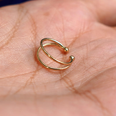 A solid yellow gold Double Cuff earring resting in a model's palm