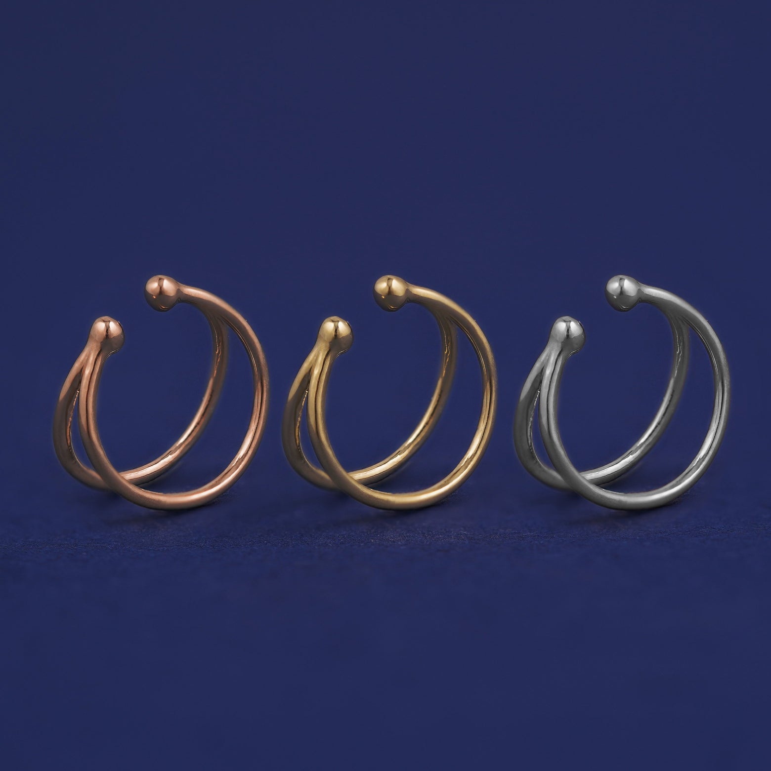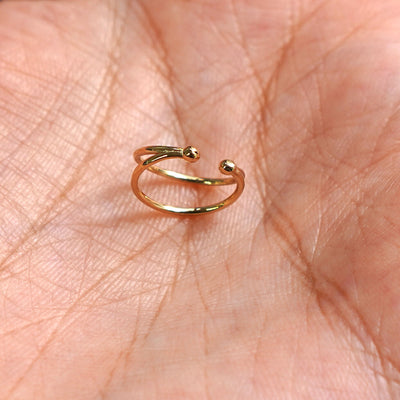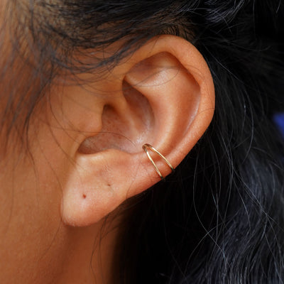 Close up view of a model's ear wearing a 14k solid gold Double Cuff