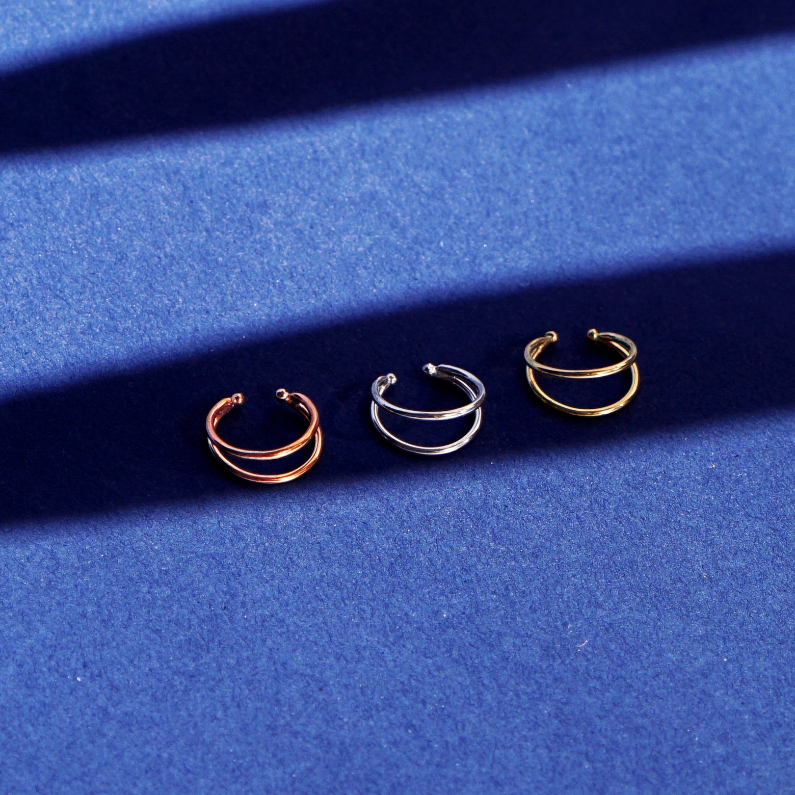 Close up view of a model's ear wearing a rose gold Double Cuff