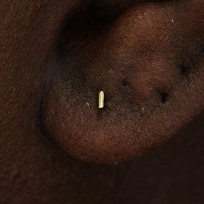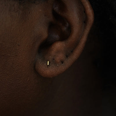 Close up view of a model's ear wearing a small line Earring in Yellow Gold.