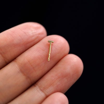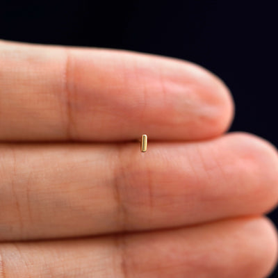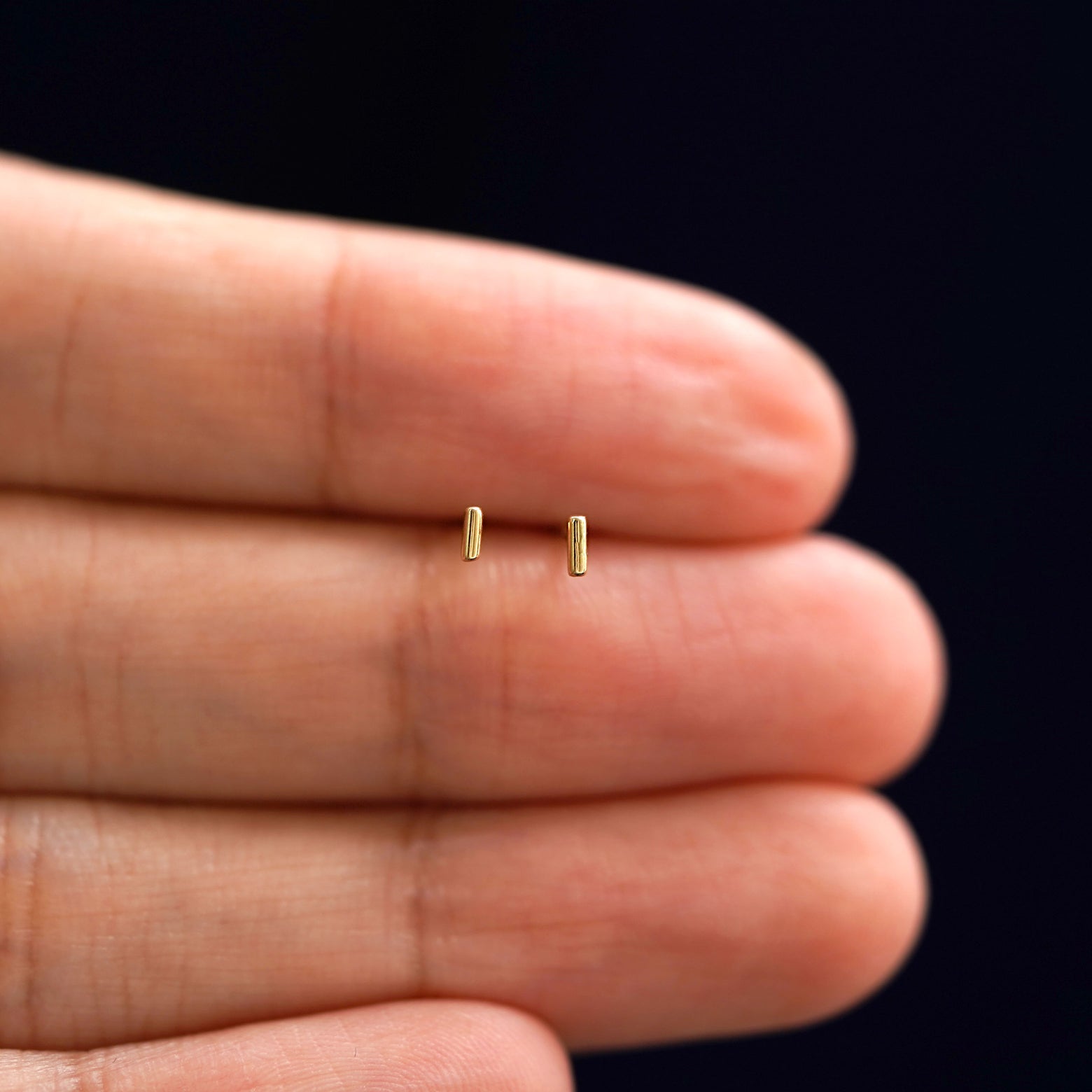 A 14k gold Small Line Earring sitting sideways on a model's fingertips to show detail
