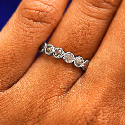 This gorgeous diamond eternity band is an elegant piece of jewelry with an understated look. It features genuine rose-cut salt and pepper diamonds set in a 950 platinum or solid 14k gold band with milgrain detailing. The perfect standout wedding band for your standout masc, femme or androgynous partner.