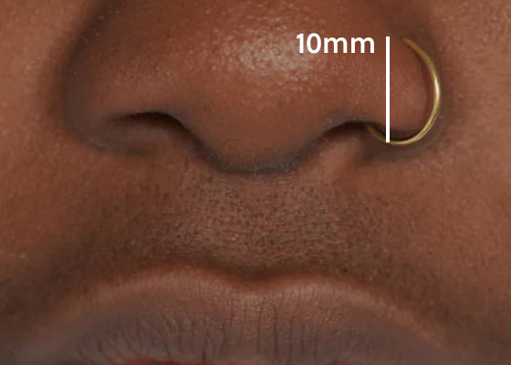 A models nose with a drawn line from the bottom of the nostril to the top of the piercing showing the distance is 10mm