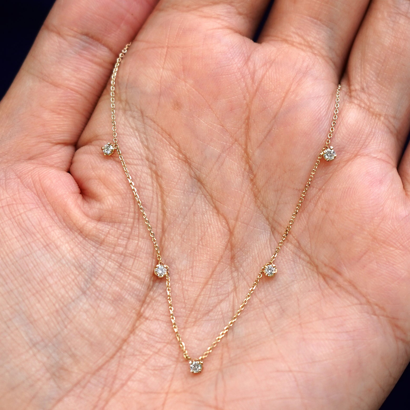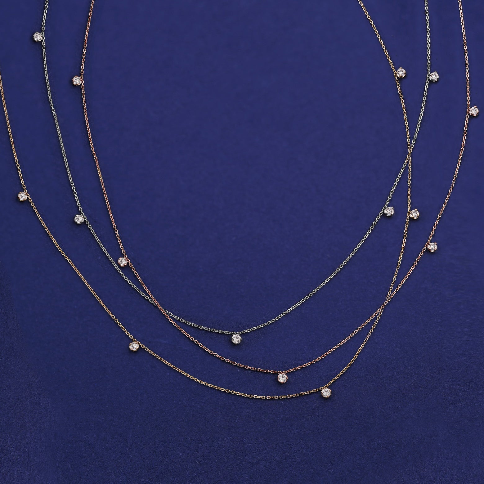 Gorgeously glamorous, this station necklace is made with sparkling diamonds on our elegant 14k gold cable chain. Whether you're working, lounging, or out living your best life, our dainty but durable diamond necklace is the perfect solid gold accessory. The Cable Chain secures with a lobster lock and easy-to-grip Automic Gold AU plate.