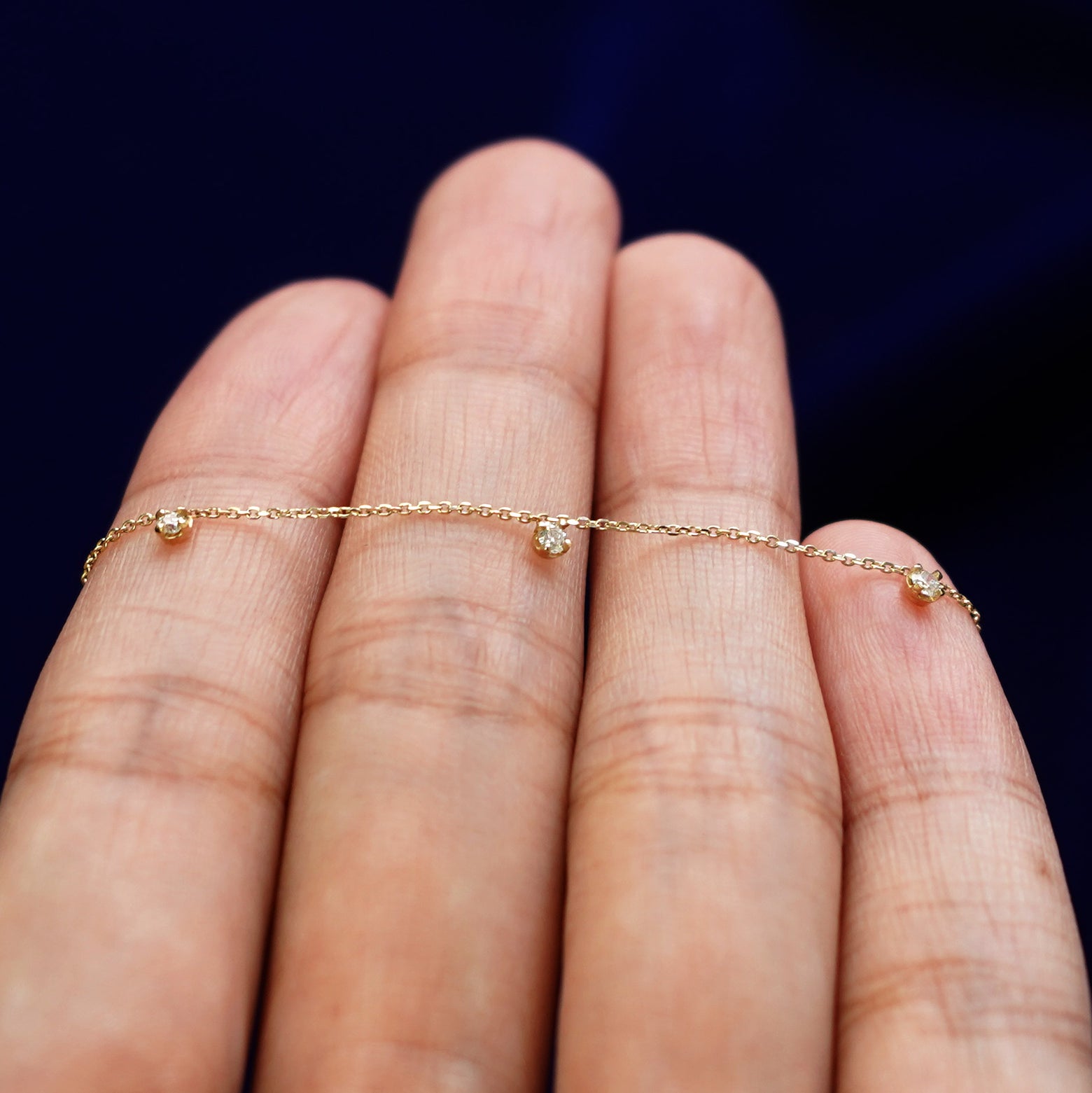 A yellow gold 5 Diamond Cable Necklace resting on a model's fingers