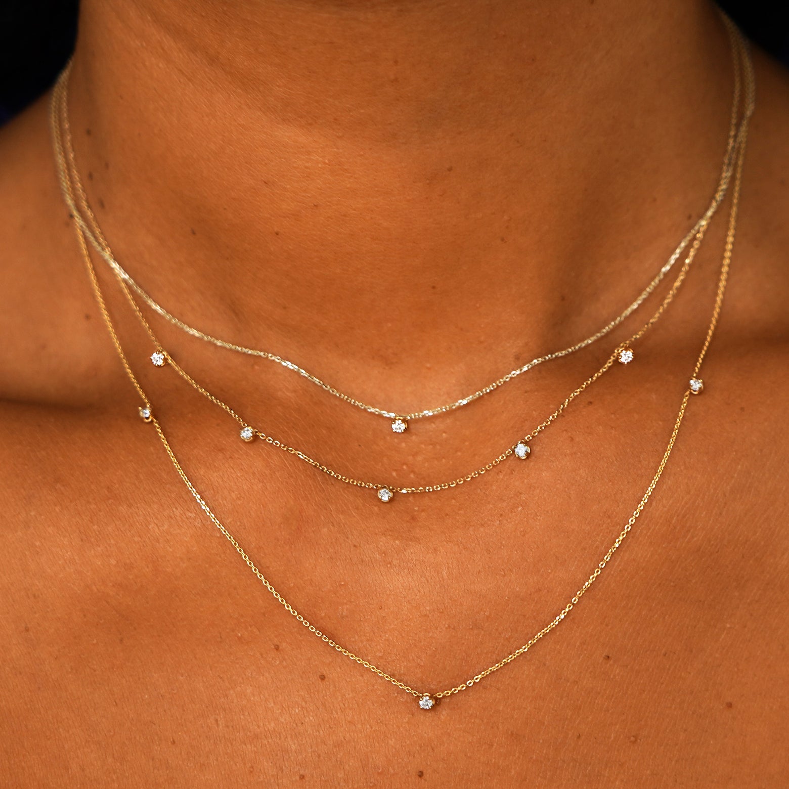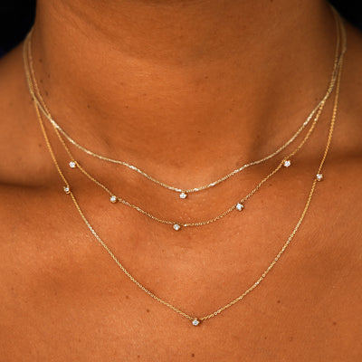 A model wearing a Diamond Cable Necklace, a 3 Diamond Cable Necklace, and 5 Diamond Cable Necklace layered