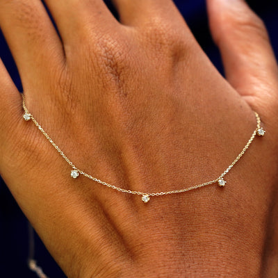 A solid gold 5 Diamond Cable Necklace resting on the back of a model's hand