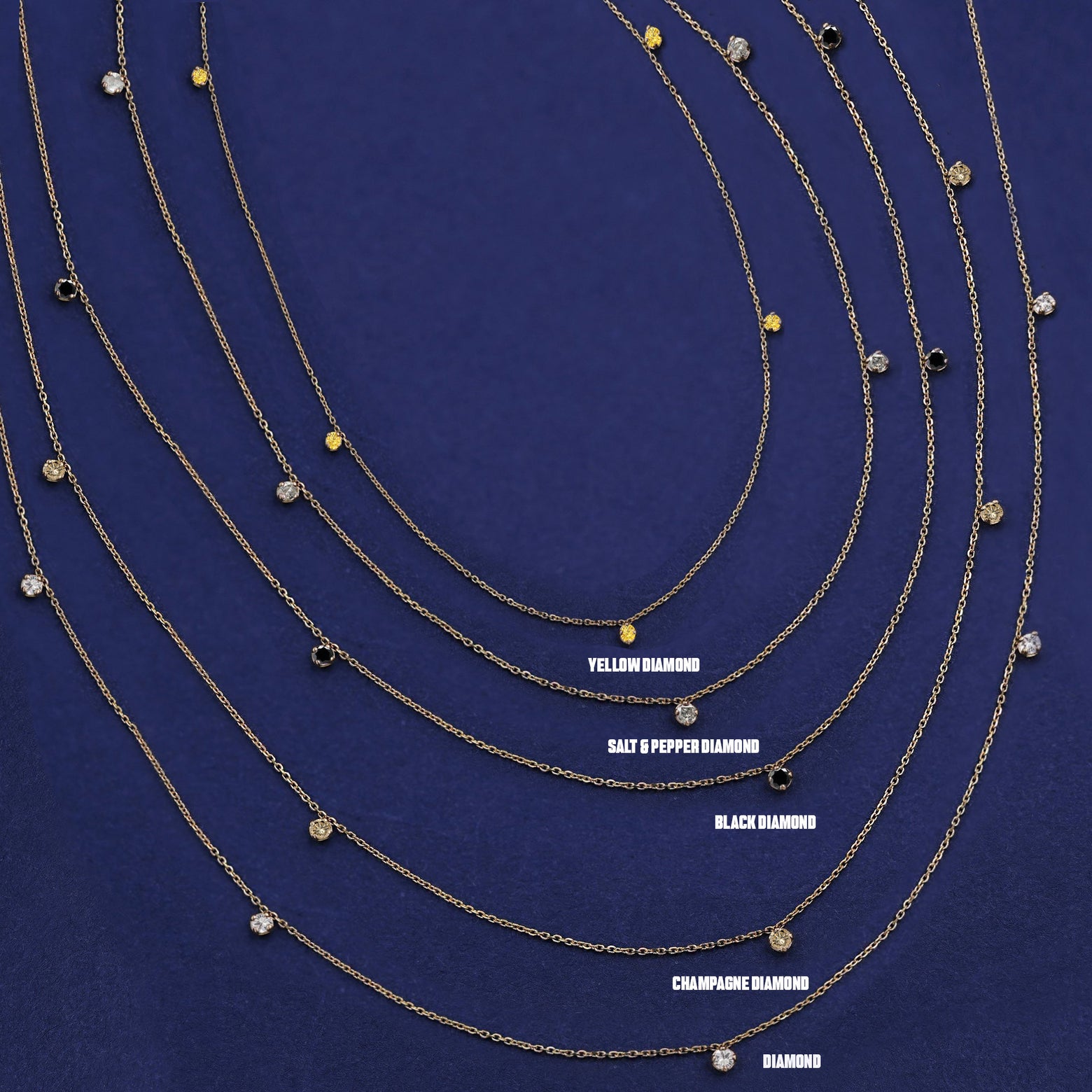 Five versions of the five Diamond Cable Necklace showing Yellow, Salt and Pepper, Black, Champagne, and Clear diamonds