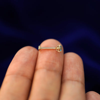 A solid 14k yellow gold Aquamarine Flatback Piercing resting on the back of a model's hand
