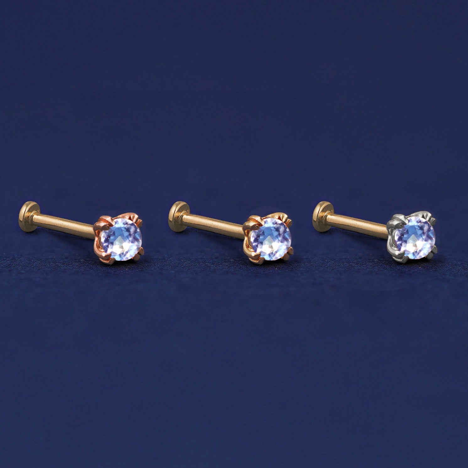 March birthstone jewelry at its finest, this flatback aquamarine stud piercing is made to be worn day or night. Whether you’re sleeping in or going out, this dainty threadless push in stud has your back. Our flat backs are crafted only in 14k yellow gold to avoid sensitivity.