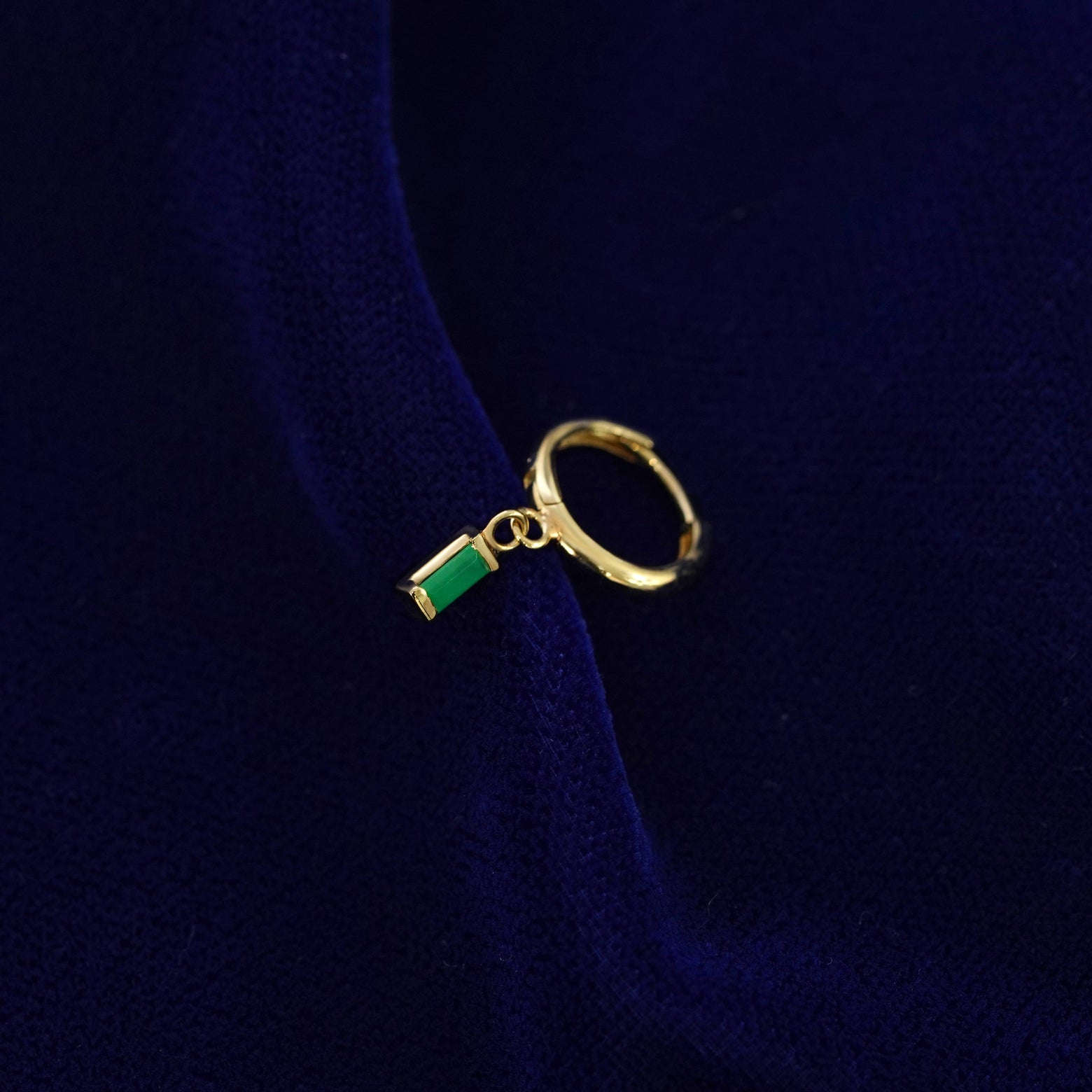 A recycled solid 14k gold Baguette Emerald Dangle Huggie Hoop earring on a dark blue background