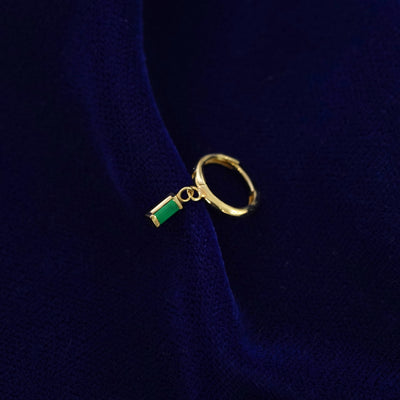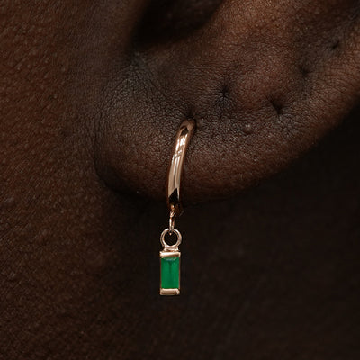 A solid 14k yellow gold Baguette Emerald Dangle Huggie Hoop closed on a model's fingertips