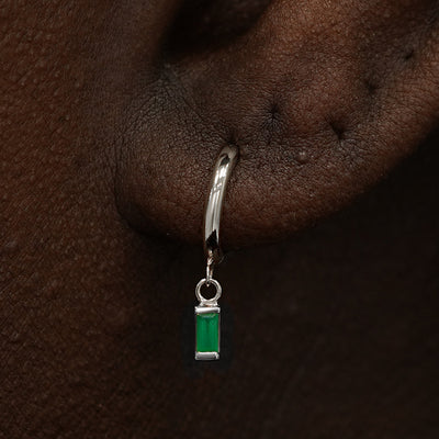 A small curvy huggie hoop earring with a dangling baguette green emerald charm balanced on a models finger