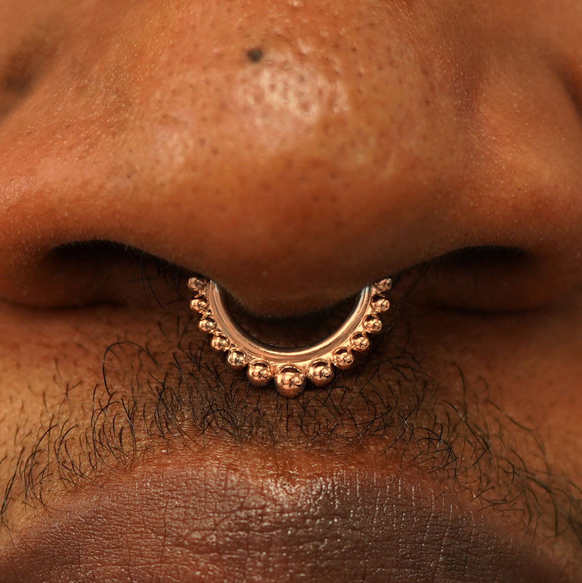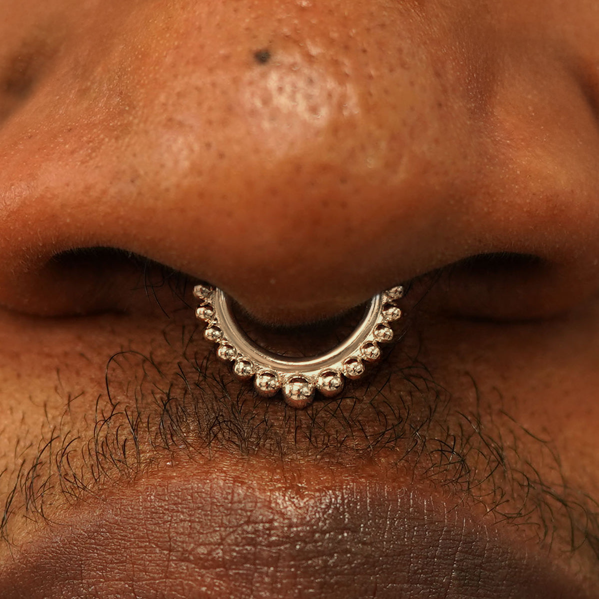 The perfect blend of classic design and stand out style this Beaded Septum ring has it all. This septum comes in both pierced and non-pierced versions and features stunning graduated beads along the outside of the hoop all in solid 14k gold. Wear this seamless septum ring as an earring or in a daith, cartilage, or other piercing.