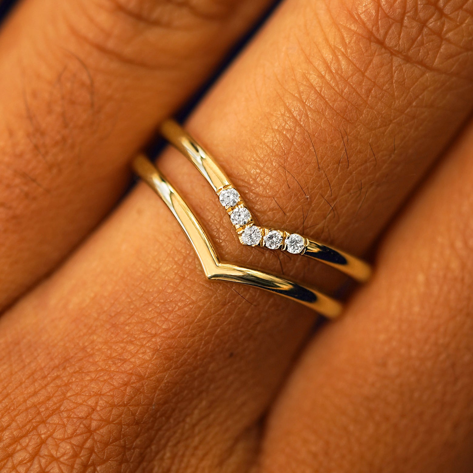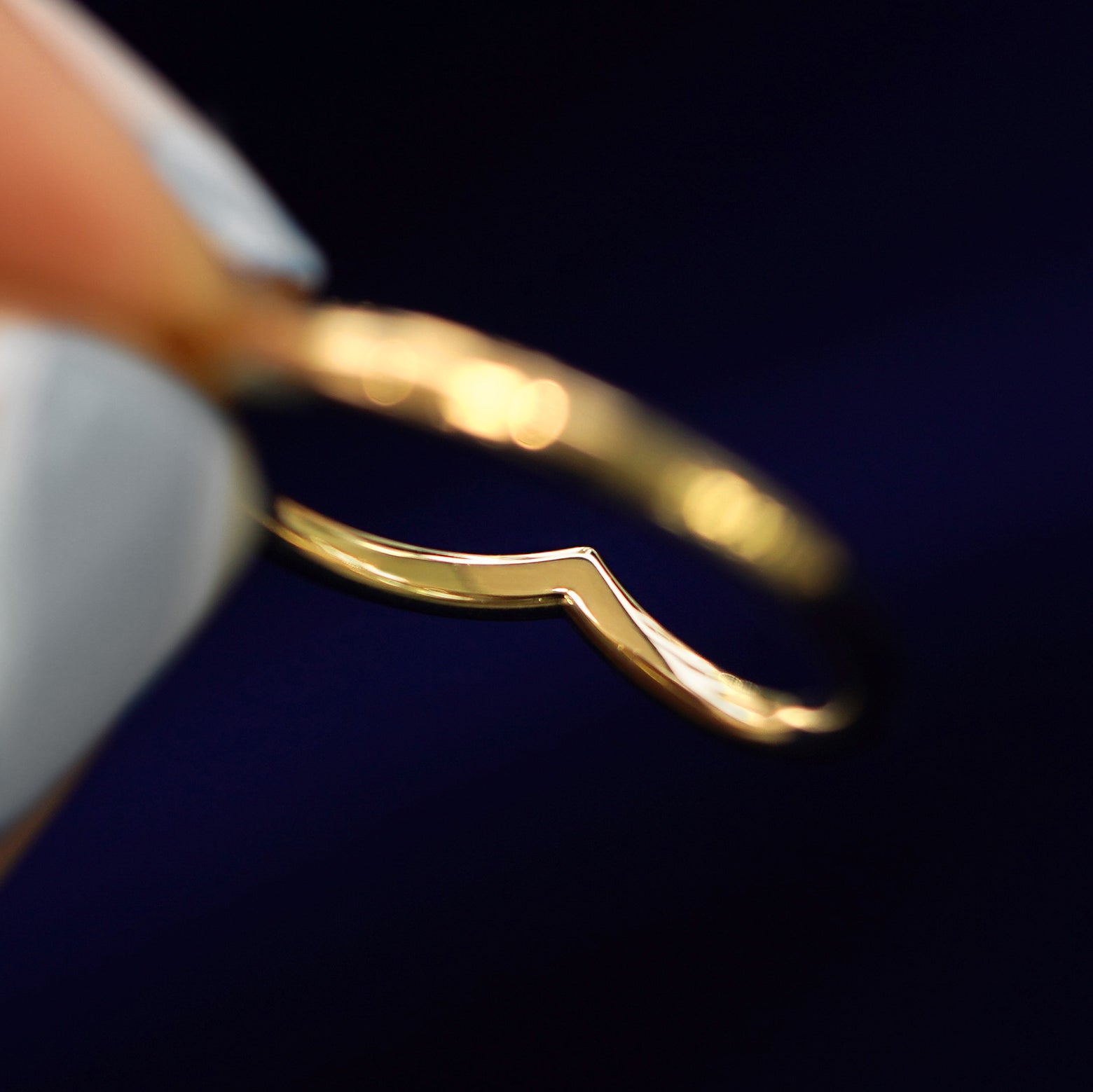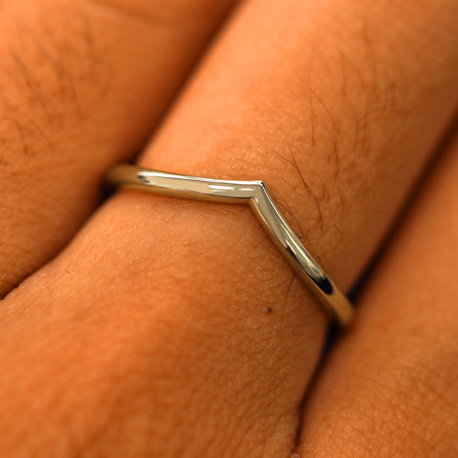 This thin V-shaped band is crafted in recycled solid 14k gold or 950 platinum. Wear it as an everyday ring as part of a stack or alone. This elegant chevron ring also makes a great stackable wedding band to complement any engagement ring.