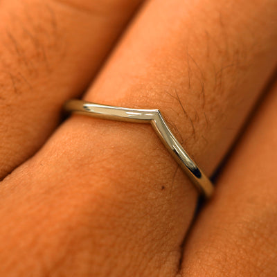 Close up view of a model's fingers wearing a 14k white gold Chevron Band