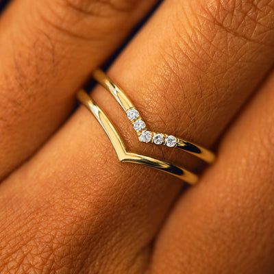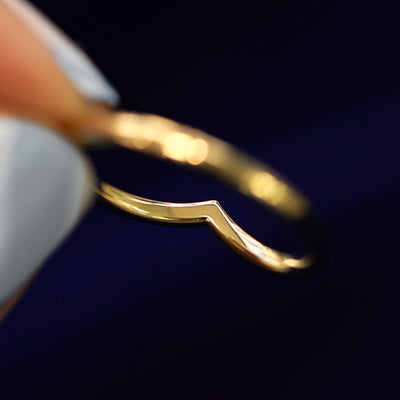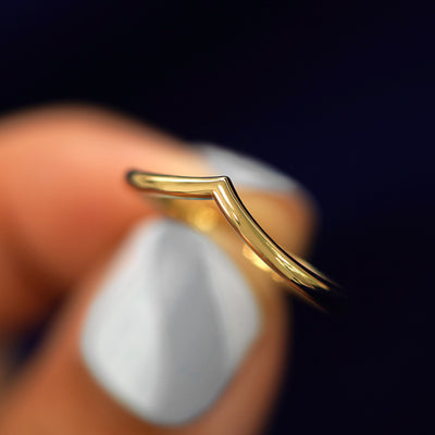 Close up view of a model's fingers wearing a 14k yellow gold mirror finish Chevron Band