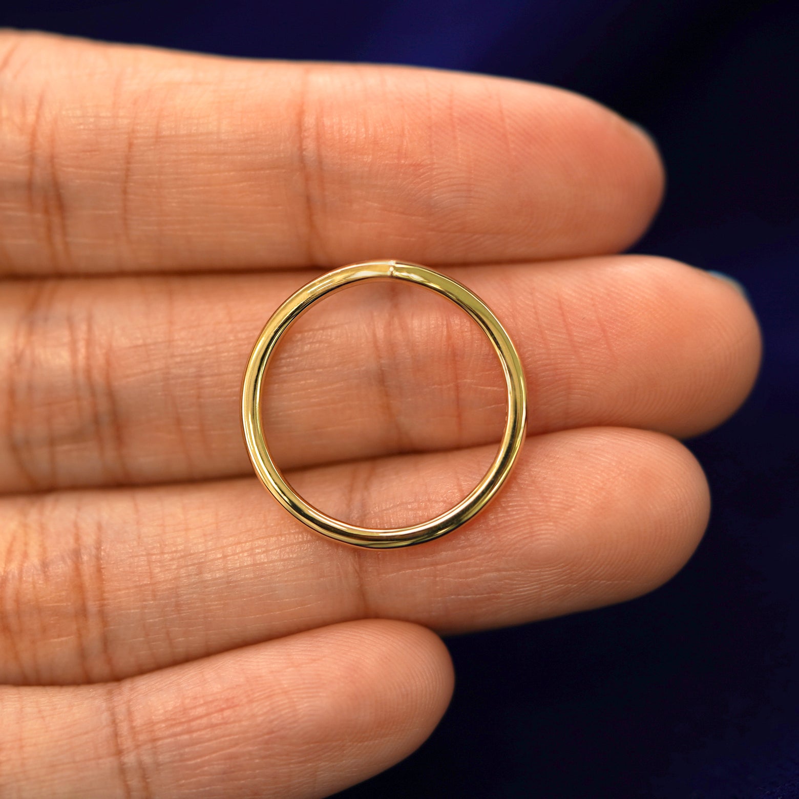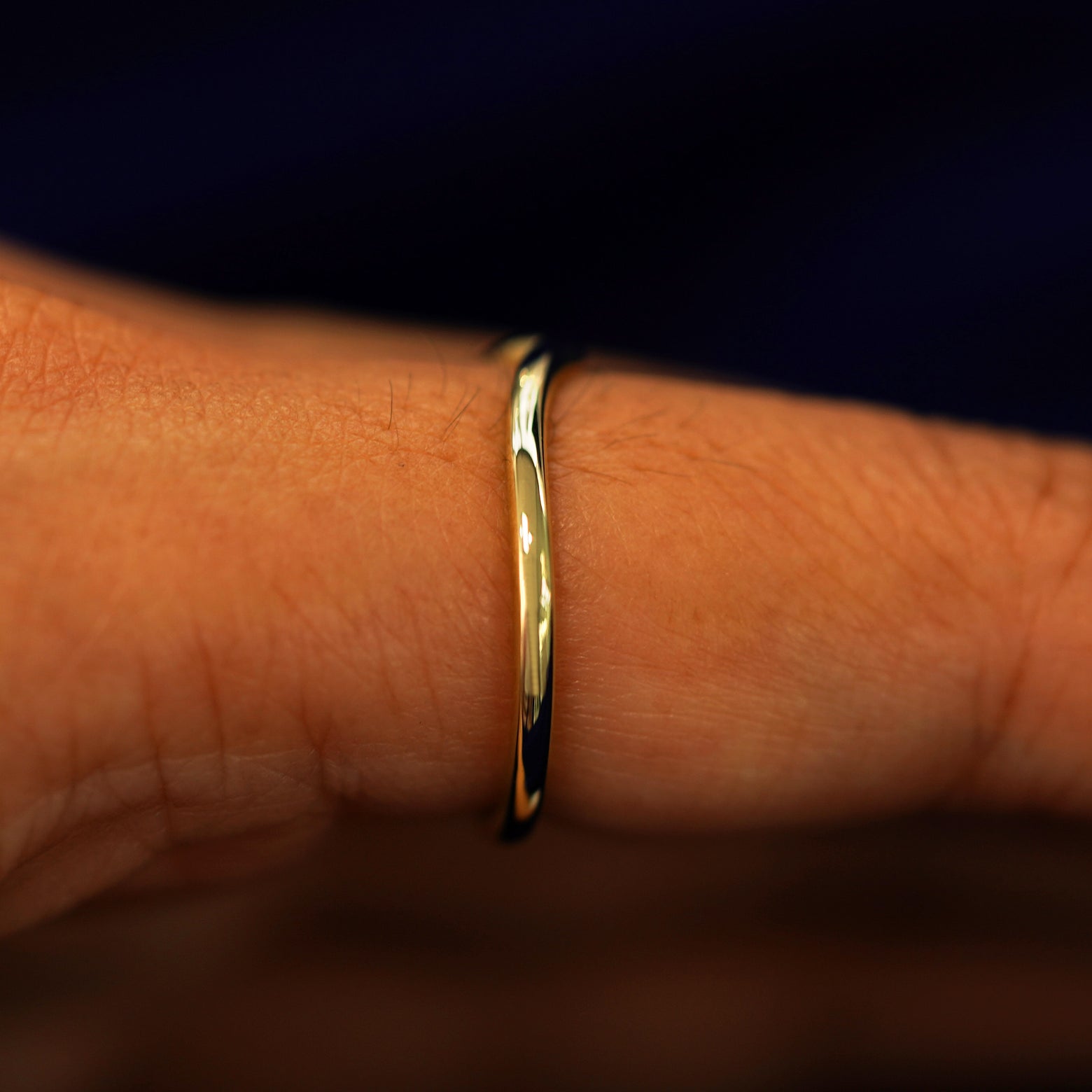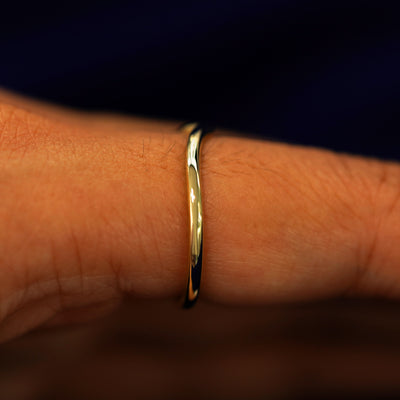A yellow gold Chevron Band in a model's hand showing the thickness of the band