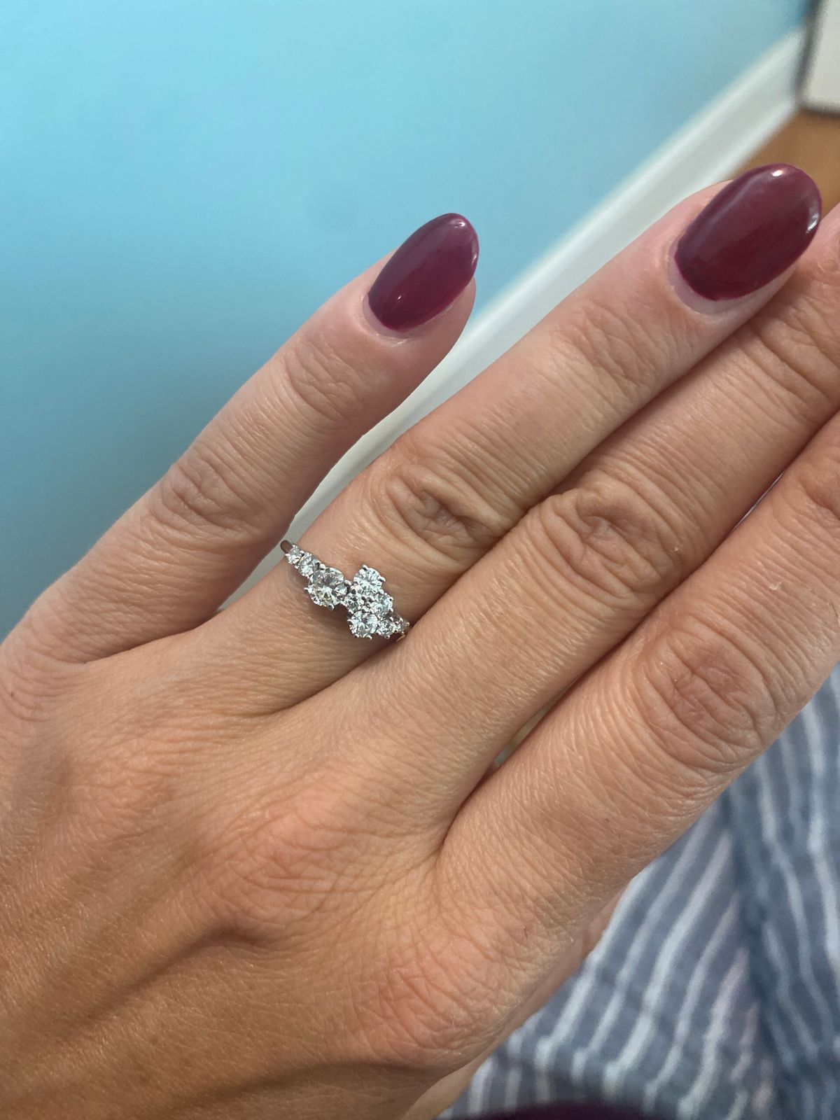 Close up view of a model's fingers wearing a 950 platinum Diamond Cluster Ring